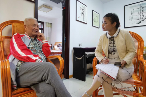 采访幸福老人、曾参加金萧支队的文艺老战士胡丁 ( 刘建中摄影)