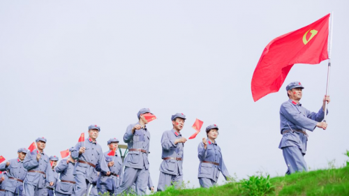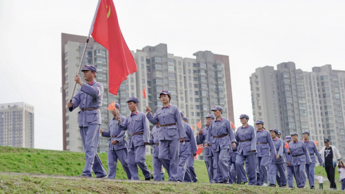 在接下来的时间里,第一方阵的党员志愿者穿着红军服装通过行走和红歌传唱接力形式传递中国共产党员艰苦奋斗、矢志不渝的拼搏精神;