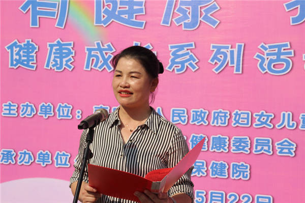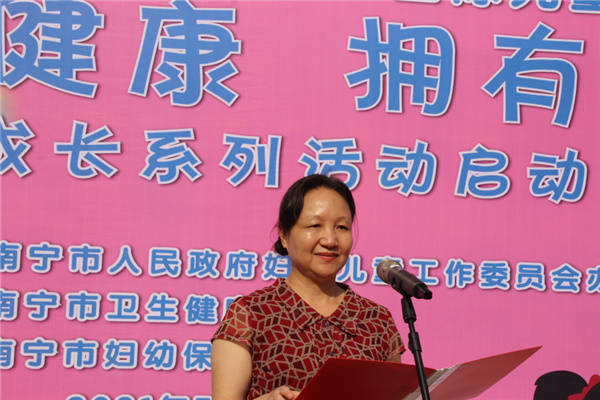 南宁市卫健委副主任李琳珊活动启动上发言 张春梅/摄影 南宁市卫生健康委员会副主任、妇幼健康服务科负责人李琳珊代表市委、市政府对全市小朋友致以诚挚的节日问候,祝他们身体健康,开心幸福,天天向上,快乐成长。她说,关心和帮助儿童健康成长,是全社会的一项重要任务,希望市妇幼保健院深入扎实开展有益儿童健康成长的活动,大力实施帮扶贫困儿童就学的行动,用真情关爱儿童,用行动服务儿童,使广大儿童的身心得到更好的发展,更好地快乐生活、健康成长,为健康南宁赋能。