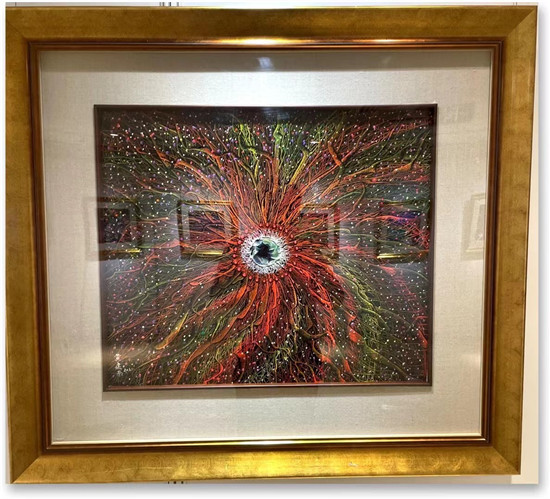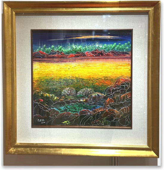 而虹霞满天的《心中的歌》,则如宇宙心底火山爆发时,喷簿而出的光焰,透彻乾坤的同时,更透彻心灵,让人感觉到了万物复苏的春天,不禁忍不住呐喊一声:我劝天公重抖擞,不拘一格降人才,孕育精神,继往开来,无所畏惧。特别需说明的是,这幅金黄色居中的《大地歌谣》,则是中国气概的另外一种呈现,正在构建人类命运共同体的中华民族,已经彻底改变祖祖辈辈面朝黄土、背朝天的历史宿命,完成了站起来到富起来的过渡,正在开始居于世界地缘政治中心而强起来,中华民族伟大复兴的光辉历程,所以,这幅《大地歌谣》是灿烂的,更是辉煌的,是一带一路构建人类命运共同体进行曲中的序曲,实为典型的中国声音唱出的中国歌声,最为嘹亮,最为璀璨!