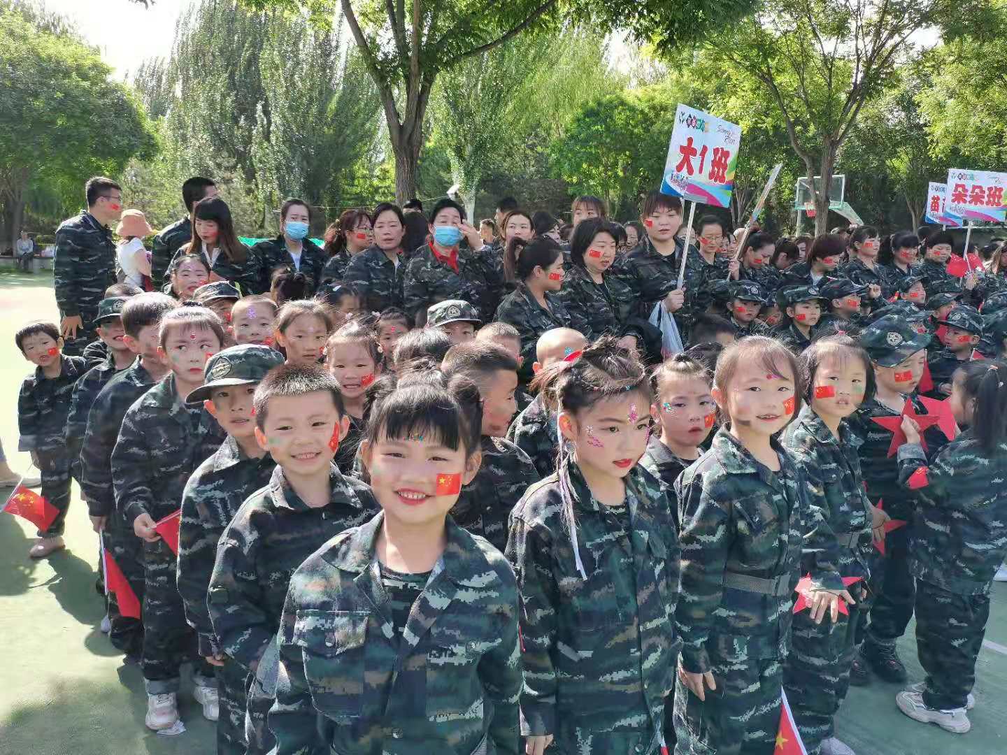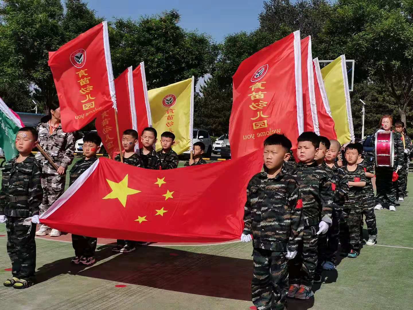 今天的活动现场有青春活力的老师,威武霸气的教官,还有跳蚤市场的童年足迹和小记者采访,这次的六一是别致的,活动取得了圆满成功,通过本次活动充分展示了本园孩子们积极向上,健康成长,进一步激发了全体老师和孩子们的爱园热情,并更好地宣传、展示了育苗幼儿园全体园丁良好的精神风貌,也让孩子们度过了一个开心快乐而有意义的六一国际儿童节。