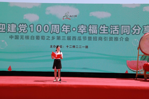 图第十二师221团党委常委、副政委张慧丽做开幕致辞 在第十二师221团湘兵文化广场活动现场,企业家、职工和游客们热情高涨,最重瓜王和最甜西瓜比赛把现场气氛推向高潮,20名参赛选手带着精心挑选的西瓜上台参加比赛。最终,四连职工阿孜古丽家种植的西瓜以15.81公斤的重量获得“瓜王争霸赛”冠军,四连职工王艳婷种植的西瓜以15.5%的含糖量,获得“最甜西瓜争霸赛”冠军。 第十二师221团四连职工阿孜古丽·阿里木表示:“这是我家第三次参加西瓜比赛,今天获得“瓜王争霸赛”冠军,我特别开心,今后一定会更好学习西瓜种植技术,争取种出个头更大、品质更佳的西瓜。”