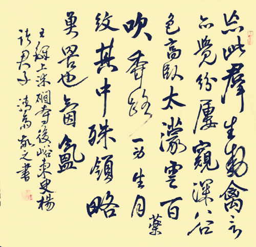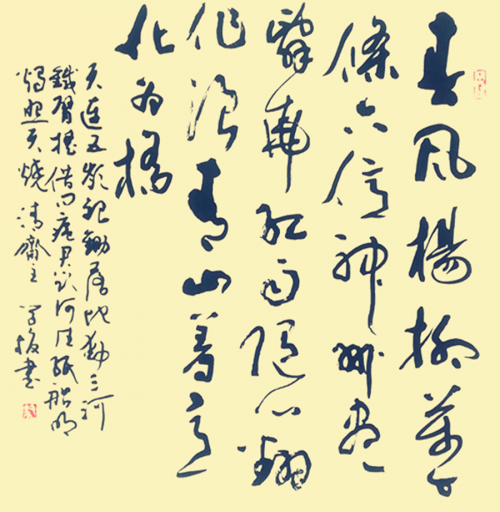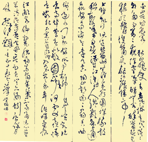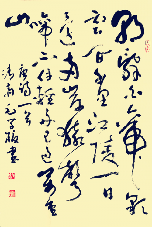 毛学校把草书、楷书、汉碑、汉隶、行草等字体集中变形,融汇于一体;同时结合大草的笔法使得作品连绵不断。其笔触,毫不拘泥概念化的规范,而是随手生发,或中或侧、或方或圆、或藏或露、或敛或纵,触处成形;其结体,则善于随形布势,或铺张排比、或敛聚收放、甚至依倚穿插,应心隐手。在具象与抽象中,展现出中国书画同源的艺术精髓;在山形云影、风帆飘动中,诠释着中国文字博大精深的象形表现力。这样的结合使文字变得有金石铁声,飘逸洒脱,大气磅礴、自然合道,宛若天成。而这种独特的书写风格,则促成并终而奠定了他在书坛坚不可摧的独立地位。