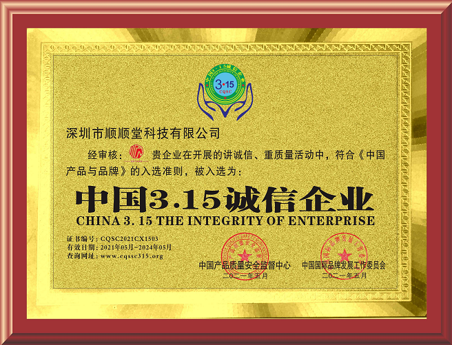 深圳市顺顺堂科技有限公司,在2021年3.15国际消费者权益日之际,该公司凭借诚信守法、重质重量的企业作风荣获中国3.15诚信企业荣誉称号,获得了社会和消费者的肯定,也充分证明了顺顺堂科技维护经济市场安全有序发展的一份责任之心。