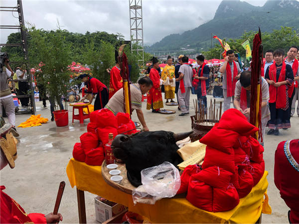 2021年广西环江•毛南族分龙节暨第七届世界自然遗产文化旅游节活动现场 张春梅/摄影 系列活动以毛南族国家级非物质文化遗产展演——神秘毛南祈福仪式拉开序幕,毛南语称为“肥套”,是毛南族古老文化的代表。仪式以敬三界公展开,祈求得到护佑。三界公爷是毛南族人最崇拜的一位保护神。仪式的举行,让游客观众欣赏到毛南族古老文化最神秘的一面。
