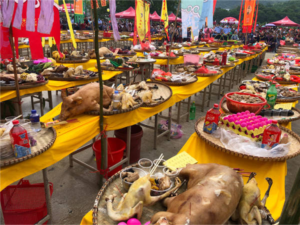 环江毛南族自治县县人大常委会主任谭仁谋宣布2021年广西环江·毛南族分龙节开幕 张春梅/摄影 活动现场,游客可以体验同顶、同填、马革等毛南族传统体育竞技和传统棋艺比赛;搭建的毛南特色美食一条街,展销着具有民族特色的各色小吃;毛南族百年簸箕宴,可以品尝美味的毛南美食。同时,花竹帽编织、傩面雕刻等毛南族非遗项目也会在现场展示,让游客更加深入地了解毛南民族文化。期间,鸟粽编织技艺大赛、拔河比赛、鱼塘摸鱼、田园抓鸡、项圈套鸭等多种趣味活动供游客参与,系列活动可谓是丰富多彩、精彩纷呈。