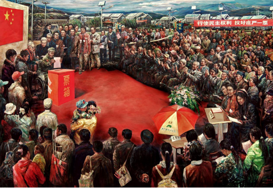 这幅油画突出首都政治文化色彩和历史文化积淀,注重人物细节刻画和神韵表现,给人一种真实的感受和生命的活力。在画面布局上以全景式构成,运用质朴凝练的笔法塑造人物。色彩运用巧妙,红绿交加,重叠相映,以色彩的张力尽显作品的思想内涵。国旗、票箱、红地毯、标语几大块红色与画面中的人群构成一个统一体,投票的老残疾军人和头戴红军帽的儿童遥相呼应,体现了老一辈革命者对新一代的寄托和期望,透过老军人手中那张选票,一定会选出有担当,有责任,有能力的人民代表为党和人民做贡献,不忘初心,砥砺前行。人民心中有一把尺子,作品近景描绘一群身背平衡尺的泥瓦匠,积极参与投票选举,红地毯上的话筒,画面寓意深刻,耐人寻味。农民质朴、善良、正直的本色,朝气蓬勃、奋发向上的精神面貌表现得淋漓尽致,且散发出泥土气息的人性之美,深厚中的朴实,质朴中的纯洁,人物鲜活生动。表达了对全面建成小康社会和实现中华民族伟大复兴伟大梦想的美好憧景。