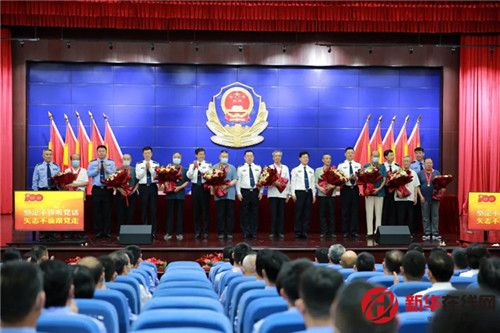 分局隆重召开庆祝中国共产党成立一百周年暨“两优一先”表彰大会。会上,为分局离退休老干部代表颁发了“光荣在党五十年”纪念章。分局领导亲手将奖章佩戴在老干部们胸前,向他们表达由衷的敬意。分局党委委员、政工室主任夏平同志宣读了分局“两优一先”先进集体和先进个人表彰决定。分局领导为获奖单位和民警代表颁发了奖牌、奖励证书,并为七月入党的党员代表颁发“政治生日”贺卡。