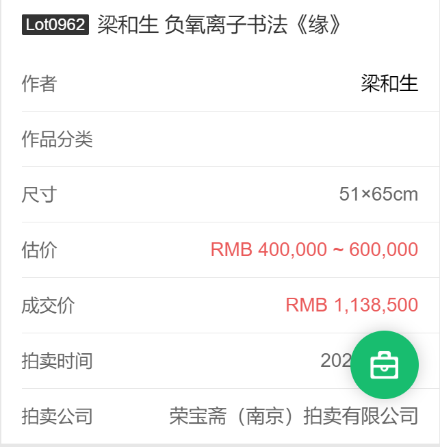 不久前 ,中国北京荣宝斋(南京)2021秋季拍卖会在江苏南京隆重举行!由北京收藏家送拍的梁和生负氧离子书画《缘》字,估价40万一60万之间,最终以113万元成交。