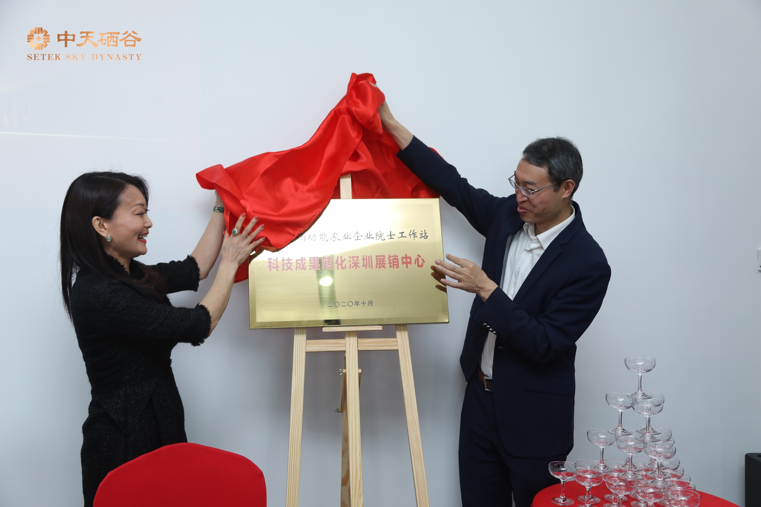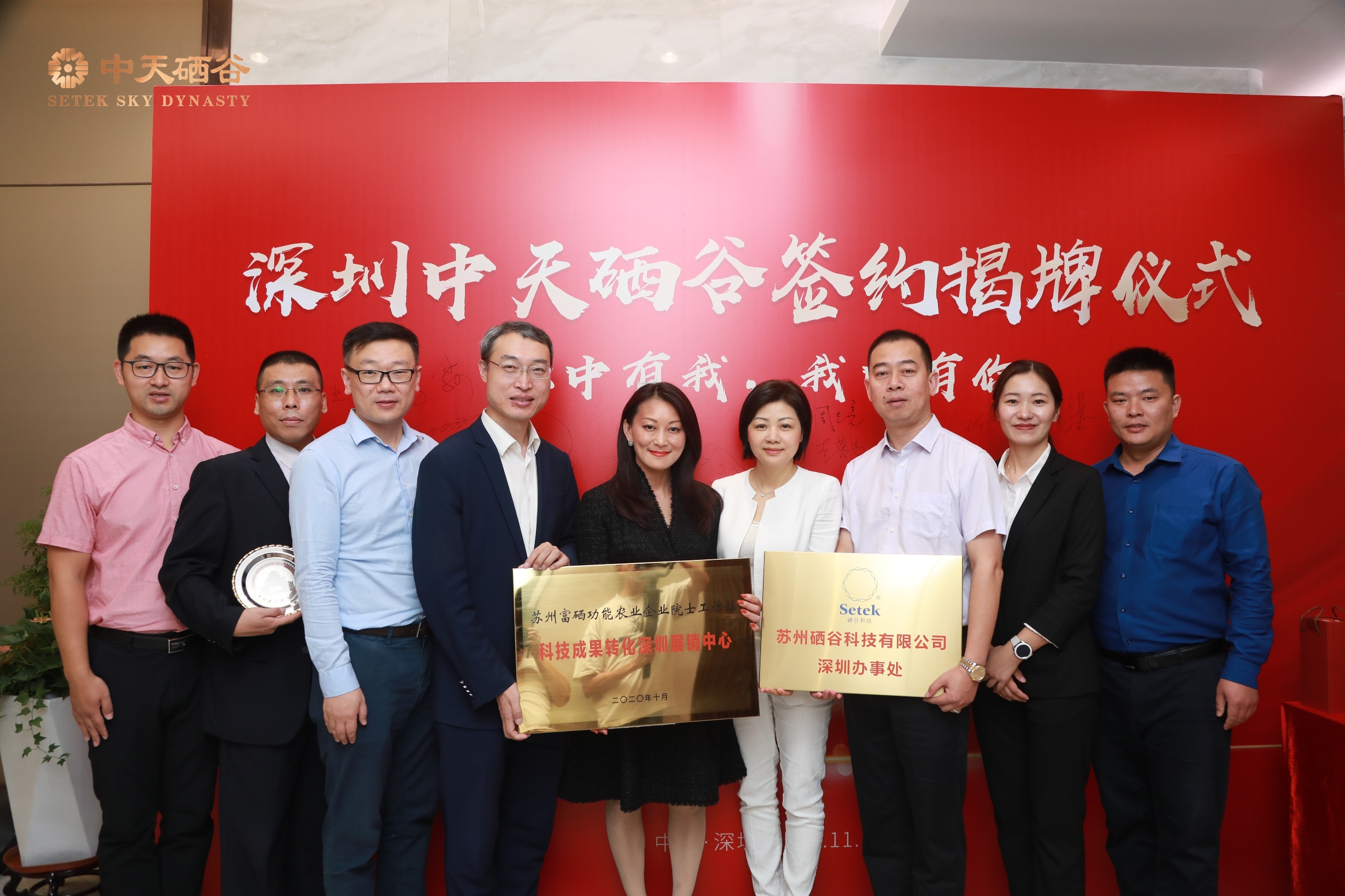 11月3日,苏州富硒功能农业企业院士工作站科技成果转化深圳展销中心签约揭牌仪式在深圳中天硒谷生物科技有限公司隆重举行。我司董事长尹雪斌博士、总经理刘颖博士、副总经理伏爱亮、研发中心总经理王张民博士受邀参加本次活动。