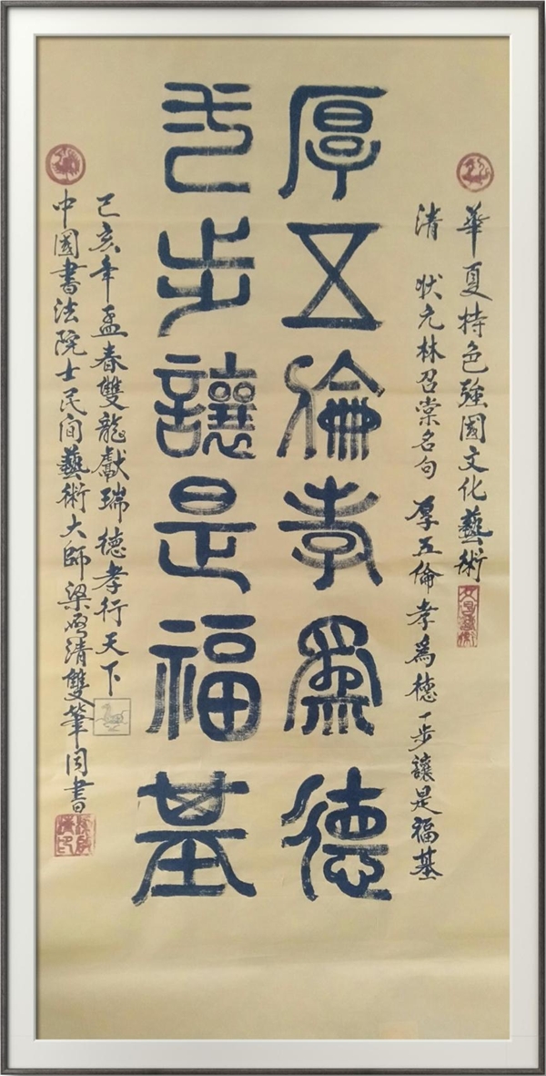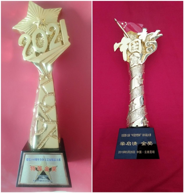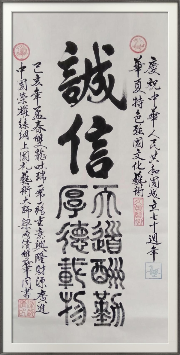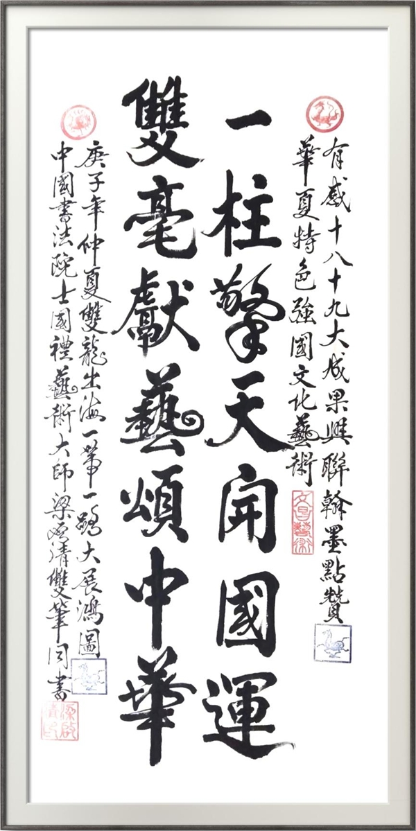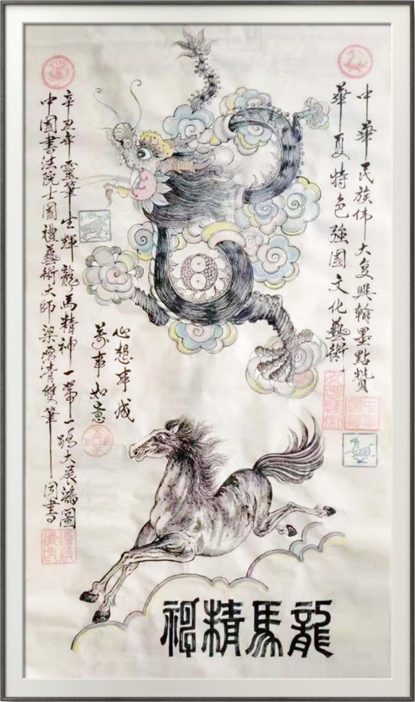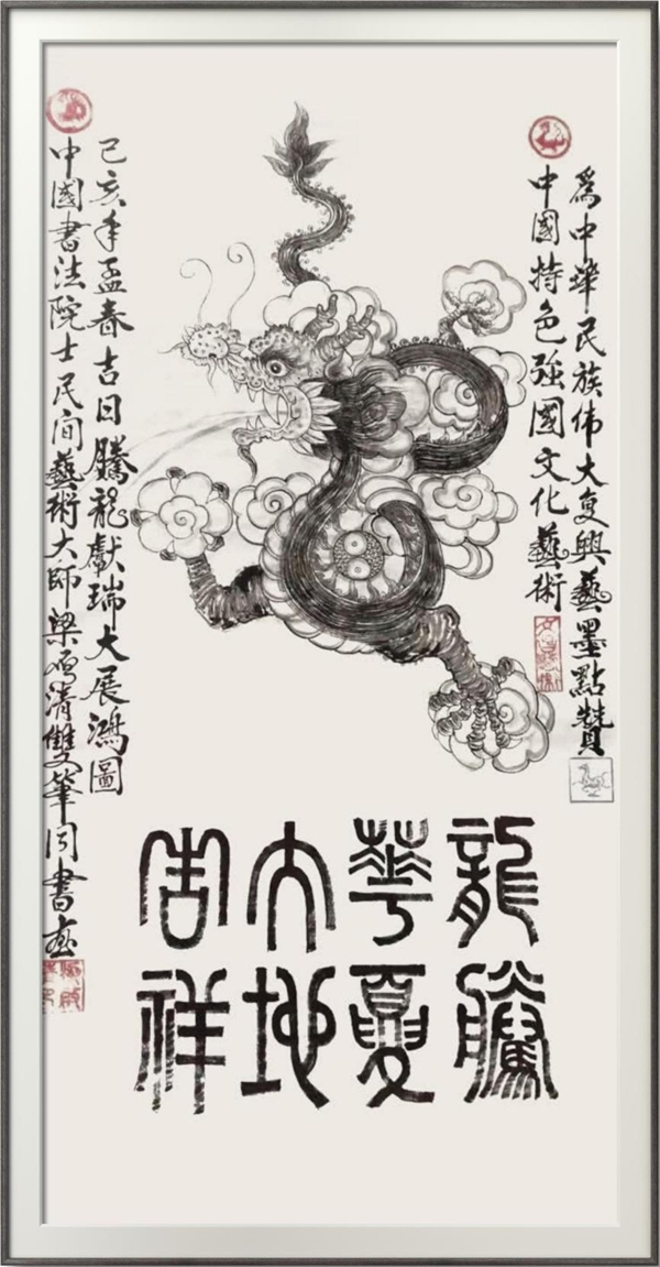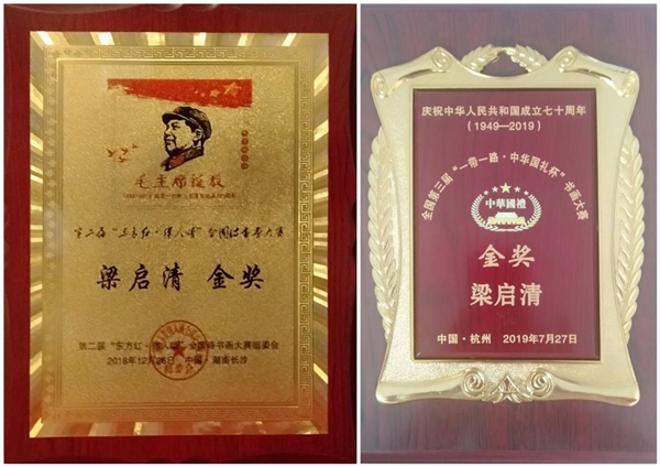 【艺术简介】 梁启清,男,广东省湛江吴川市人,出生于1945年,2005年受湛江市政府、湛江市湖光岩风景名胜区管理局聘请,承担中国雷琼AAAA级世界地质公园湛江湖光岩风景名胜区申世工程大型建筑雕塑项目火山博物馆,有80米长,4.8米高的湛江湖光岩故事浮雕壁画,东大门的千年古榕,13米高龙鱼,22米长、18米宽、6米高、400吨重的万寿神龟,(申报吉尼斯纪录)2007年建造的12.8米高双面望湖观音、望海观音、美貌端庄、如意吉祥,吸引众多络绎不绝的游客。1999年海南省三亚市政府,天涯海角旅游发展有展公司聘请梁启清雕塑鹿回头公园,九九国际婚礼节5.5米高月老像。 梁启清是我国著名的建筑雕塑大师。此外他制作的中国历史文化名人墨宝笔筒。他的雕塑巨作得到赵逊,德国世界地质科学家麦基维博士的高度赞赏。梁启清大师不但在建筑雕塑技艺大有成就,他的书画作品在艺术界也独领风骚。他的书画作品修炼功底深厚,章法与众不同,被誉为当代书画界改革先锋人物。书体章法结构大气,字画端庄秀丽,气势磅礴,技艺独一无二,双笔挥洒出神入化,楷书、行书、隶书、篆书、笔峰豪放,运笔流畅,楹联诗章,独具一格,大方得体,综合历代文化精髓,创作个人作品,独树一帜,不愧称为中华民族艺坛巨匠。他是个杰出的德艺双馨书画艺术名家。梁启清的一生在艺术事业上,刻苦钻研,而且练就双笔同书高难度大美作品。在艺术道路上,继承传统文化,在当代书画界以及工艺美术的发明创新传承达到理想的最高境界。 梁启清的诗章是采用中国上下五千年文化精髓。汉代我国文化最为昌盛时期的风水瓦当格局图案为图章,其中采用两个,一个是青龙星座,一个是朱雀星座。作为书画图章风水格局,和宅基座向装饰定位相结合,诗句楹联豪迈大气,吉祥和谐,意思是中国龙凤传人的最高艺术,一个是国宝铜马踏飞燕的方章,寓意作品的精湛高贵具有很高的艺术价值传遍世界,还有一个长形的篆体文昌艺术章,文昌帝君文曲星是人间文神,凡是读书人、有文化人都供奉他,以庇祐功名成就、文运亨通、状元及第、金榜题名。这枚章的书体都改革过是出自他的手笔,纯手工用水仲木雕刻出来的。梁启清的书法印章、笔、砚是经过世界地质公园湛江湖光岩望海观音、望湖观音开光时邀请美国纽约中华佛教协会会长和湖光岩椤严寺主持释清海大师开光点赞过,佛光普照,灵笔生辉。 2012年参加湛江市首届民俗绝技魅力湛江、双笔同书;五年崛起、幸福湛江获银奖。被吸纳为中国工艺美术协会会员。2014年双笔同书颂中华楹联工艺、一柱擎天开国运、双毫献礼颂中华,参加中国广州民间工艺博览会山花奖获铜奖,会展期间安排现场挥毫表演双笔同书技艺,并评为广东省优秀民间文艺家。 2016年中华民族历代名圣清风廉政雕塑系列,陈兰彬、林绍棠、孔子墨宝筒参加中国广东民间工艺博览会获银奖。2017年创作的大中华文宝香文化的中国梦、观音送子、麒麟送子、弥勒笑佛等浮雕装饰工艺荣获中国(深圳)国际文化产业博览交易会冬季工艺美术精品展获铜奖。被评为湛江市首届民间艺术大师,被吸纳为中国民间文艺家协会会员。 现为中国书法院院士,北京华夏兰亭书画院客座教授,庐山毛体书画院高级研究员,中国书画名家协会会员,华夏博学国际文化交流中心会员,中国诗书画家网书画研究院副院长,中国书画职称评定中心评定为国家一级书法师,国家一级美术师。中国互联网艺术总监,国际名人百科外联部主任,中国传统文化外交官,全球艺术名家。评估其书法作品每平方尺为12000—18000元(人民币)。评估其国画作品每平方尺为28000—36000元(人民币)。书法作品国内市场每平方尺30000—36000元(人民币)。国际市场为4500—5400(美元),国画作品为60000—66000(人民币),国际市场为每平方尺9000—9900(美元)。 现正准备申报国家级文化创作专利及申报文化传承非物质文化遗产。莫道高堂存瑰宝,安知乡野有奇葩。梁启清正是一枝这样的中华民族,五千年民族文化的继承传统、创新、独具一格的艺术奇葩。 【作品赏析】