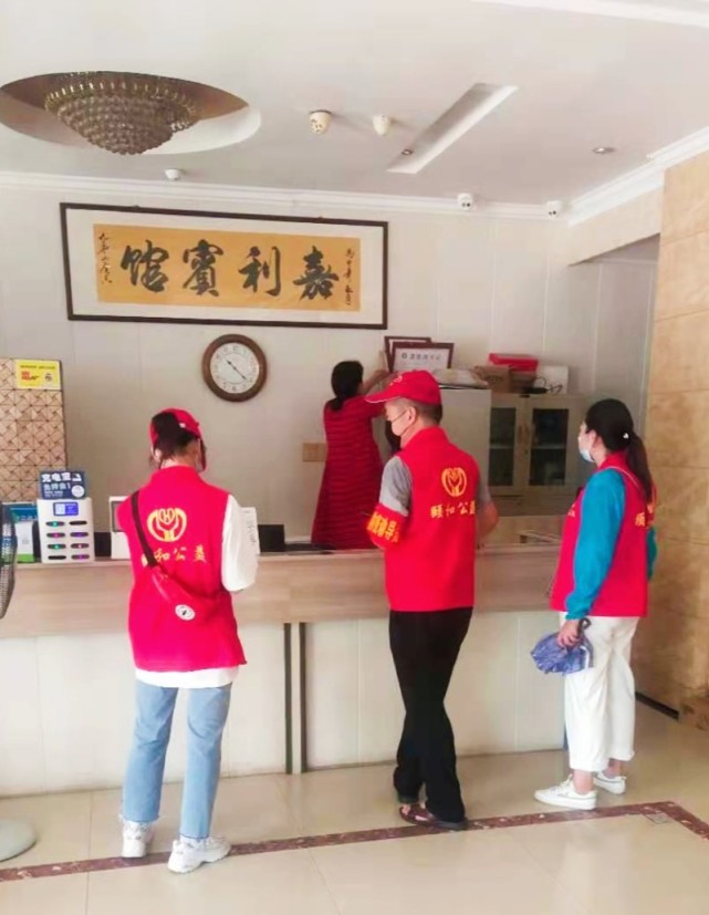 明梦娟摄:进宾馆 颐和公益志愿者开展活动有时3人一组、有时4、5人一组,前三次巡检规劝线路从华联商厦出发到财富广场经新建路一带,发现一出、劝规一处。15日下午,从华联商厦至阳明西路一直往西富巷菜场进行巡检劝规,从中也碰到不少难题,巡检中也有个别经营户极不配合,还冷嘲热讽,志愿者们始终以礼相待,耐心多次劝规,让这些经营户及从业人员认识到自己的态度应回到防疫意识这根弦仍不能放松, 防疫群控人人有责上来,劝规后他们都能配合工作。8月22日,颐和公益在理事长齐国民组织下,12人分二个小组,第一组由作者带队从国贸大厦至花鸟市场,沿长元路向西至锦江华园,另一组由颐和公益理事长齐国民带队。第一组检查劝导了10个单位,分别是厨具超市、百丈潭生态鱼缸、杭州湾洗浴宾馆、家家福二高店、小乐惠食堂、风云烟酒、银河宾馆、每惠多超市、宝济堂药店、三江源药店锦江华园店。厨具超市、百丈潭生态鱼缸、风云烟酒这 三家需继续劝导整改,其余七家规范,有防控意识。但整个花鸟市场基本失控。