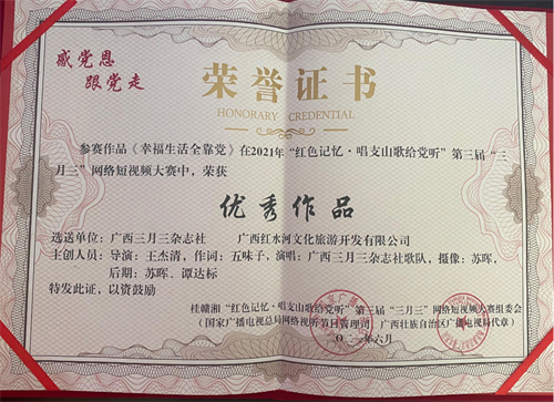 近日,由广西三月三杂志社、广西红水河文化旅游开发有限公司选送,王杰清导演主创的《幸福生活全靠党》在“红色记忆·唱支山歌给党听”第三届“三月三”网络短视频大赛中脱颖而出,被评为优秀作品。