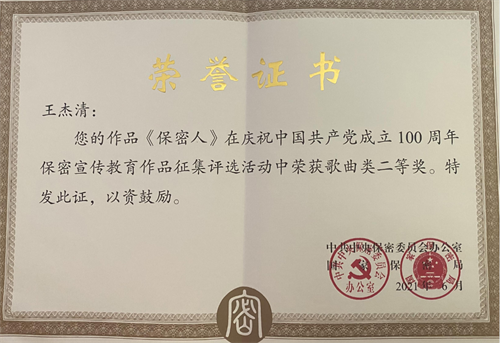 除了导演这一重身份外,王杰清还是广西音乐家协会会员,对音乐有着专业的理解和鉴赏能力。在中央保密办、国家保密局开展的以“党旗飘扬、保密护航”为主题的庆祝中国共产党成立100周年保密宣传教育作品征集评奖活动中,王杰清作品《保密人》荣获歌曲类二等奖,是广西选送歌曲类参赛作品中获得的唯一一个最高奖项。