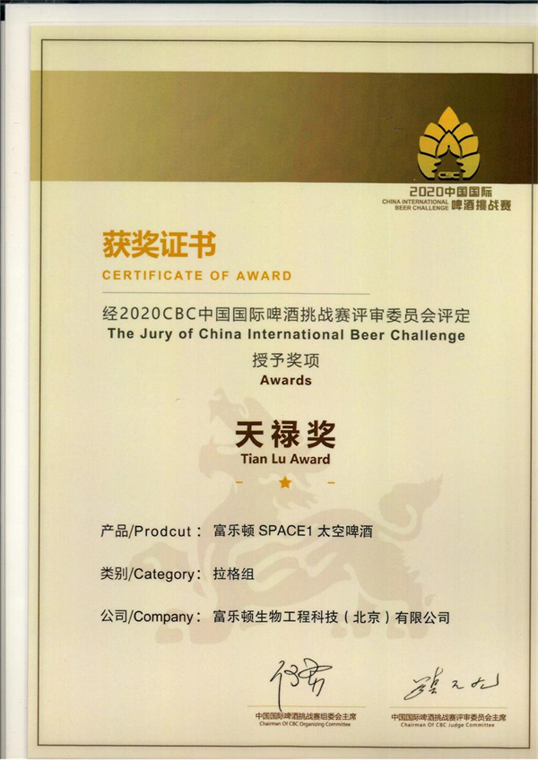 近日,备受瞩目的2020中国国际啤酒挑战赛暨颁奖盛典在中国泸州落下帷幕。在众多参赛品牌中,由国家高新技术企业富乐顿生物工程科技(北京)有限公司研发的“ESPACENO”系列太空啤酒“SPACE1”荣获赛事最高奖“天禄奖”。这款啤酒将空间酵母技术与现代啤酒工艺相结合,实现了口感、健康与科技元素的完美融合,受到评委会的一致好评。
