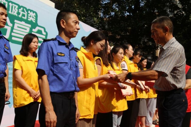图:为垃圾分类公益宣讲员颁发聘书 6月21日,狮子山社区以党建为引领,在化工厅物业小区率先启动生活垃圾“撤桶并点+定时定点”集中投放试点工作。为了提高居民参与积极性,社区招募40余名垃圾分类志愿者,开展垃圾分类倡导工作。 针对一些高领老人、独居老人等特殊群体,社区联合物业公司和垃圾分类志愿者成立了一支为老服务垃圾分类志愿者队伍,每天都会有志愿者去有需要的老人家中宣传垃圾分类知识,并帮助将垃圾分类投放到站点。 台上,垃圾分类桶边指导员郭大为用他的亲身经历,为大家讲述了小区实施垃圾分类“撤桶并点、定时定点”投放以来的变化。“一开始我们的厨余垃圾收集量半桶都不到,现在每天稳定在三四桶。不仅小区环境变好了,居民之间的关系也更和谐了!” 在长沙,每天都会产生数千吨生活垃圾,这些垃圾去哪儿了?又是如何被处理的?在故事分享会上,社区工作人员徐苏斌为居民讲解了长沙生活垃圾处理终端设备是如何将垃圾变废为宝的,让大家对垃圾分类知识有了更深入的了解。 养成垃圾分类好习惯,离不开导向精准、深入持久的社会宣传动员工作。当天,天心区“我为群众办实事——垃圾分类我来讲”聘任仪式还聘用了一批热心公益事业、专业知识丰富、表达能力强的垃圾分类公益宣讲员,今后,他们将积极发挥特长,深入机关、街道、学校等开展宣讲,为推动垃圾分类工作提供宣传和指导服务,共同建设美丽长沙。 活动现场,狮子山社区居民刘静静还为大家带来了垃圾分类DIY创意作品。“垃圾分类要从娃娃抓起,我想通过这些的可爱的作品吸引孩子们的注意,让他们把垃圾分类理念带入家庭。”刘静静分享道。