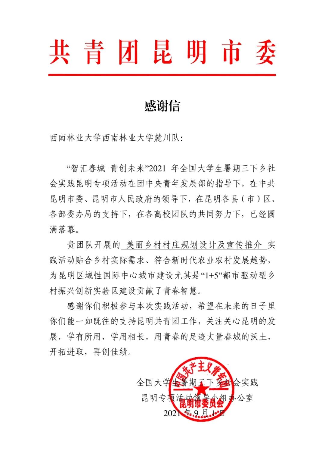 在团中央青年发展部的指导下,在中共昆明市委、昆明市人民政府的领导下,在昆明各县(市)区、 各部委办局的支持下,西南林业大学“美丽乡村村庄规划设计及宣传推介”乡村振兴创新团赴云南省昆明市富民县石桥村开展暑期“三下乡”社会实践活动已于8月4日圆满结束。团队成员们优秀的表现得到了昆明专项活动领导小组办公室的一致赞扬,并发来《感谢信》。
