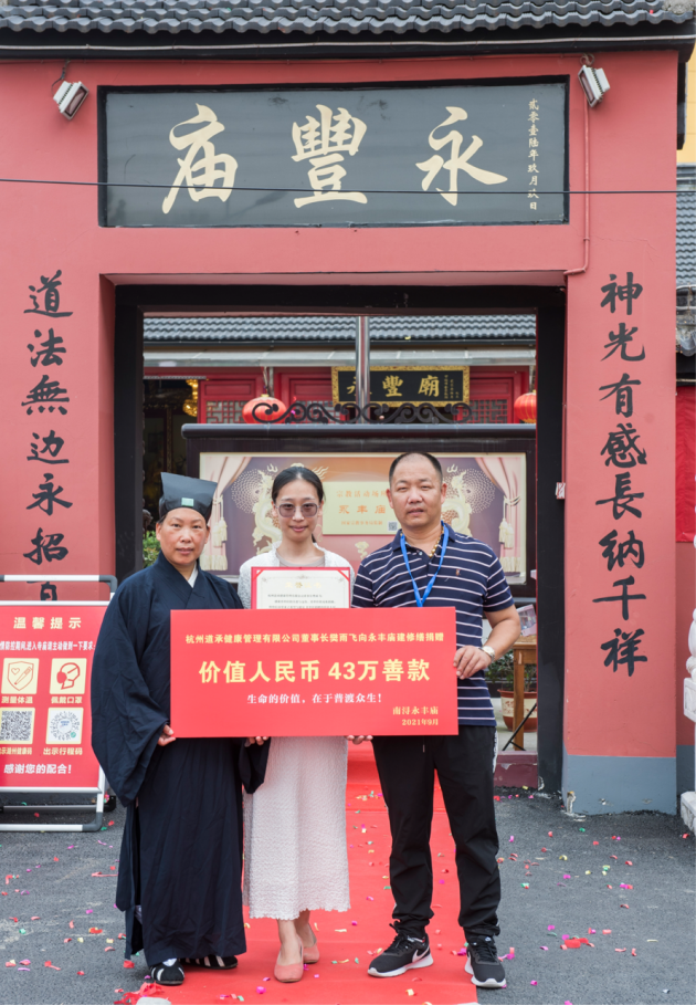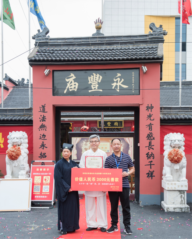 9月9号上午9点9分,静芬道长回归道观主持仪式在湖州市南浔区东迁街道“南浔永丰庙”成功举办。永丰庙负责人沈建培、广惠道人、法事主持和现场嘉宾送上鲜花迎接静芬道长。