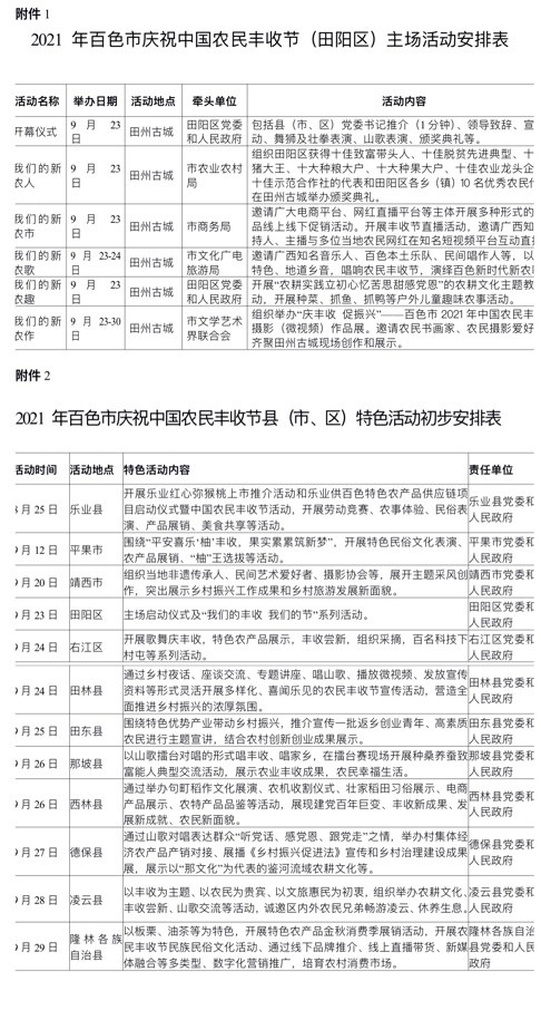 一年一度又秋分,雏菊生香满院薰。 秋分,一个举国欢庆丰收的节日。中国是农业大国,重农固本是安民之基、治国之要。广大农民在我国革命、建设、改革等各个历史时期都作出了重大贡献。在每年的秋分日设立“中国农民丰收节”是一项重大决策,是第一个在国家层面专门为农民设立的法定节日。近年来,百色市委、市人民政府乘着中国共产党的百年华诞的雄风,带领百色市各族人民群众在党的坚强领导下战胜了疫情、夺取了脱贫攻坚的伟大胜利,如今正朝着全面建成小康社会和下个“一百年奋斗目标”而努力奋斗。为了激发社会各界,包括全市广大农民的积极性和创造性,全面推进乡村振兴,百色市委、市人民政府定于9月15-30日举办以“庆丰收、感党恩、奔富路”为主题的2021年百色市庆祝中国农民丰收节系列活动。 ![]() 2021年中国农民丰收节百色系列活动新闻发布会现场 张春梅/摄影 此次活动,是以新时代中国特色社会主义思想为指导,深入贯彻落实关于中国农民丰收节的重要讲话、贺信精神,以“庆丰收、感党恩、奔富路”为主题,秉承“庆祝丰收、弘扬文化、振兴乡村”宗旨,坚持“农民主体、因地制宜、开放创新、节俭热烈”原则,采取线上线下相结合的方式,合力开展 “1+5 ”“2+9”重点特色活动。“1+5 ”,即办好 2021 年百色市庆祝中国农民丰收节1个主场(田阳区)活动以及“我们的丰收我们的节”5大系列活动;“2+9”,即办好靖西市、凌云县2个重点分场特色活动和其他9 个县(市、区)庆丰收特色活动。 9月23日,百色市将在田阳区田州古城主会场举办2021 年百色市庆祝中国农民丰收节启动仪式暨“我们的丰收,我们的节”系列活动。届时将在主舞台将开展各县(市、区)党委书记推介、领导致辞、舞狮及壮拳表演、山歌表演、授牌颁证、宣布启动、等一系列活动来庆祝农民丰收节。除了主舞台的活动外,还在田阳区开展“我们的丰收,我们的节”5大系列活动,概括为“5个新”,分别是: ![]() 新闻发布会现场 张春梅/摄影 1. 我们的新农人。组织推选全市十大养猪大王、十大种粮大户、十大种果大户、十佳致富带头人、十佳脱贫先进典型、十佳农业龙头企业、十佳示范合作社共70名先进代表和田阳区各乡(镇)50名优秀农民代表,在启动仪式上宣布获得推选单位和个人名单并向田阳区获得推选的代表授牌颁证,其余各县(市、区)获选单位和个人启动仪式后再发放匾牌和证书,本次推选活动不设奖金。通过推选一批先进典型,展现农民新形象、欢庆大美丰收节、共走乡村振兴路。 2. 我们的新农市。邀请广大电商平台、网红直播平台、新媒体平台、商超、批发市场等主体开展多种形式的农产品线上促销活动。开展 2021 年百色市庆祝中国农民丰收节直播活动,邀请广西知名主持人、主播与多位当地农民网红在知名短视频平台互动直播,让农民为百色丰收代言。 3. 我们的新农歌。邀请广西知名音乐人、百色本土乐队、民间唱作人等,以民族特色、地道乡音,唱响农民丰收节,演绎百色新时代新农歌。 4. 我们的新农趣。现场组织少年儿童和家长开展“农耕实践立初心 忆苦思甜感党恩”的农耕文化主题教育活动,开展种菜、抓鱼、抓鸭等趣味农事活动,引导广大少年儿童弘扬劳动精神,体验丰收节快乐。 5. 我们的新农作。组织举办“庆丰收 促振兴”——2021年百色市庆祝中国农民丰收节摄影(微视频)作品展。 ![]() 新闻发布会现场 张春梅/摄影 除了田阳主会场的精彩活动外,其他11个分会场也开展各具特色的庆丰收活动。右江区:开展歌舞庆丰收,特色农产品展示,丰收尝新,组织采摘,百名科技下村屯等系列活动。田东县:围绕特色优势产业带动乡村振兴,推介宣传一批返乡创业青年、高素质农民,进行主题宣讲,并结合农村创新创业成果展示,凸显“芒果之乡”产业科技农旅齐头并进,打造现代农业新高地。平果市:围绕“平安喜乐‘柚’丰收,果实累累筑新梦”,开展特色民俗文化表演、农产品展销、“柚”王选拔等活动。那坡县:以山歌擂台对唱的形式唱丰收、唱家乡,并在擂台赛现场开展种桑养蚕致富能人典型交流活动,展示农业丰收成果,农民幸福生活。凌云县:以农民为主、以文旅惠民为初衷,举办农耕文化、丰收尝新、山歌交流等活动,诚邀区内外农民兄弟畅游凌云、休养生息。乐业县:组织开展2021年乐业红心弥猴桃上市推介活动和乐业供百色特色农产品供应链项目启动仪式暨中国农民丰收节活动,通过开展劳动竞赛、农事体验、民俗表演、产品展销、美食共享等展现农业发展的巨大成效与变化,提高农民获得感、幸福感、光荣感。 ![]() 新闻发布会上记者提问现场 张春梅/摄影 田林县:通过乡村夜话、座谈交流、专题讲座、唱山歌、播放微视频、发放宣传资料等形式灵活开展多样化、喜闻乐见的农民丰收节宣传活动,营造全面推进乡村振兴的浓厚氛围。靖西市:组织当地非遗传承人、民间艺术爱好者、摄影协会等,结合当地丰收节庆,展开主题采风创作,突出展示靖西市贯彻落实乡村振兴工作成果和乡村旅游发展新面貌,不断提升地方旅游知名度和影响力。德保县:通过山歌对唱表达群众“听党话、感党恩、跟党走”之情,举办村集体经济农产品产销对接、展播《乡村振兴促进法》宣传和乡村治理建设成果展,展示以“那文化”为代表的鉴河流域农耕