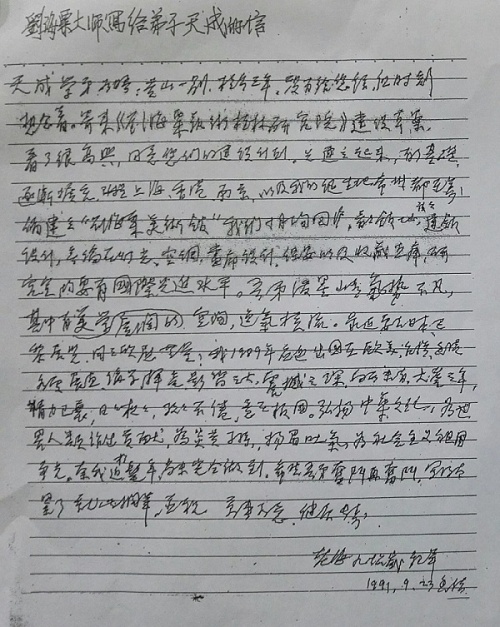 刘海粟1991年为成立刘海粟艺术桂林研究院事宜亲笔复函谢天成,并称赞“吾弟泼墨山水气势不凡,其中有广阔的美学空间,逸气横流” 刘海粟与谢天成师徒数年,情深义重。他们共同披荆斩棘、融汇中西古今、开创先河、推陈出新的艺术实践,为中国新美术的发展留下了光辉的一笔。同时,谢天成一直致力于研究、学习、提倡恩师刘海粟的艺术精神,无疑将会有着重要的历史意义与推动力。