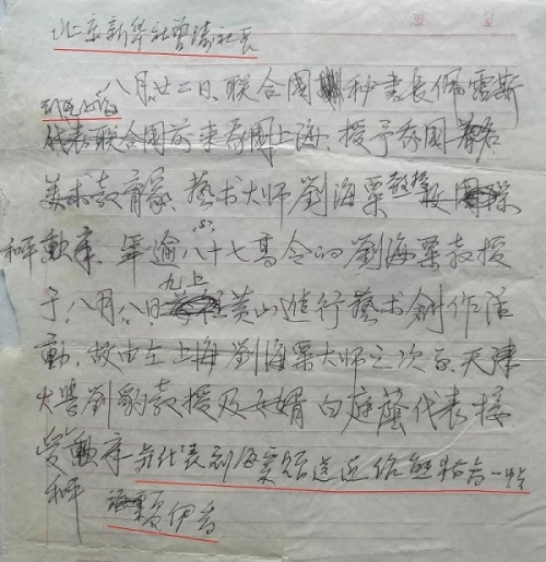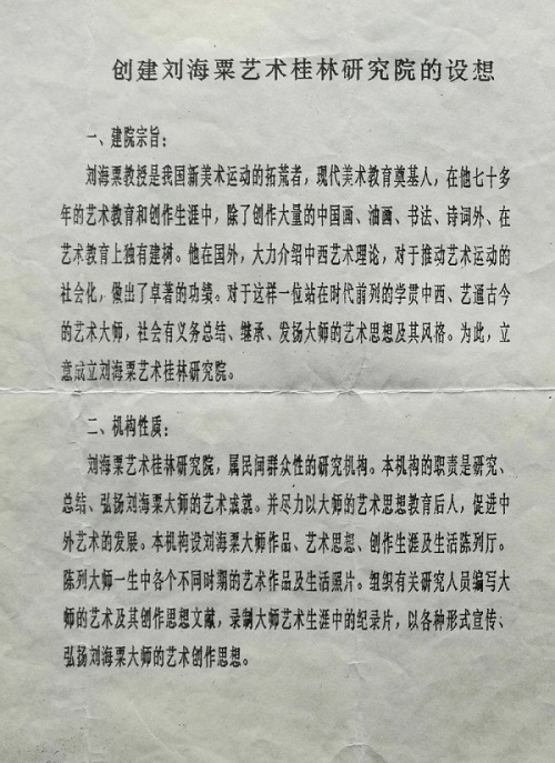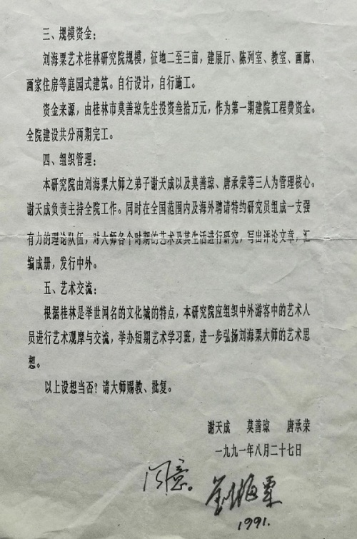 1991年谢天成所拟的《创建刘海粟艺术桂林研究院的设想》,刘海粟阅后亲笔签名同意(1)