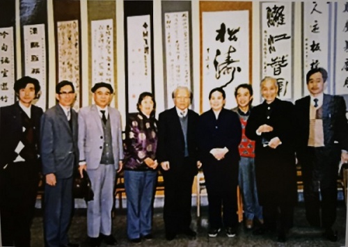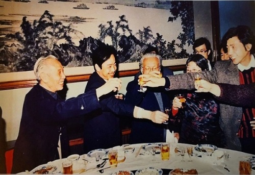名家齐聚“桂林漓江书画院”成立仪式 1988年桂林漓江书画院成立,首任院长谢天成(右一)在庆祝晚宴上向阳太阳(左一)等祝酒。