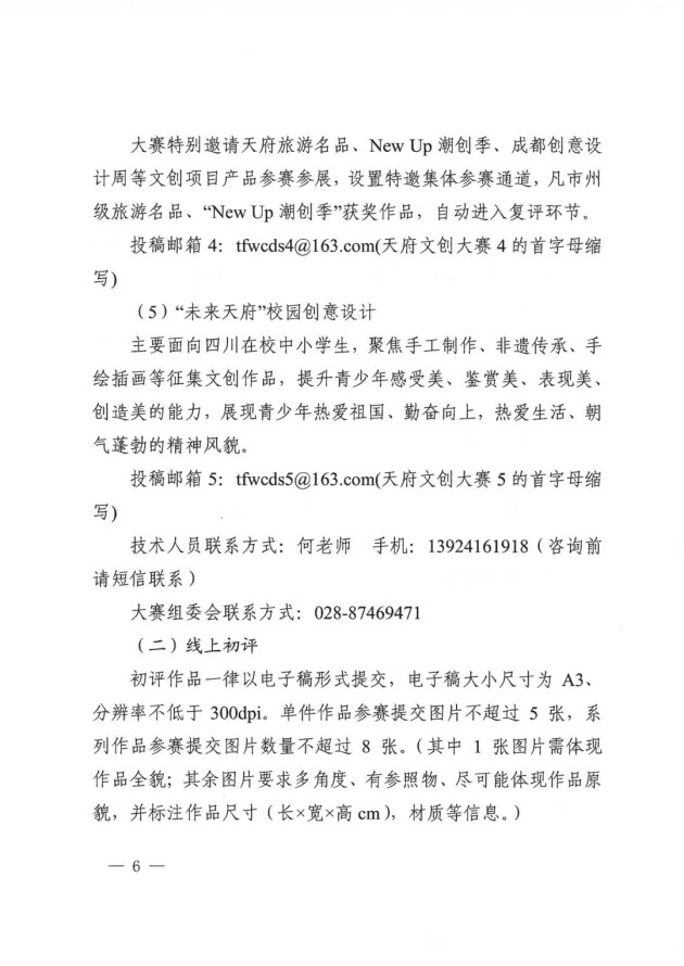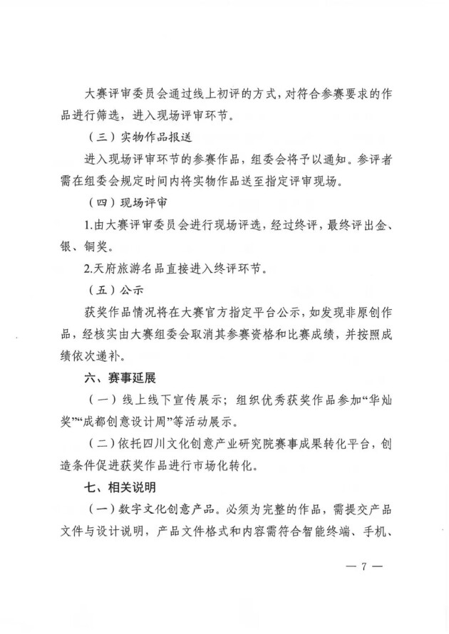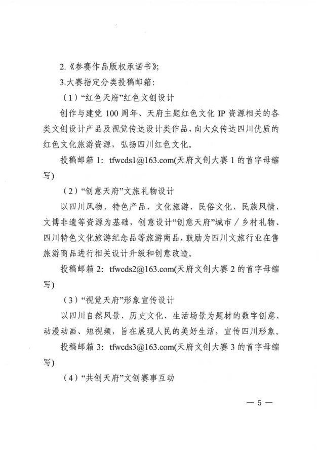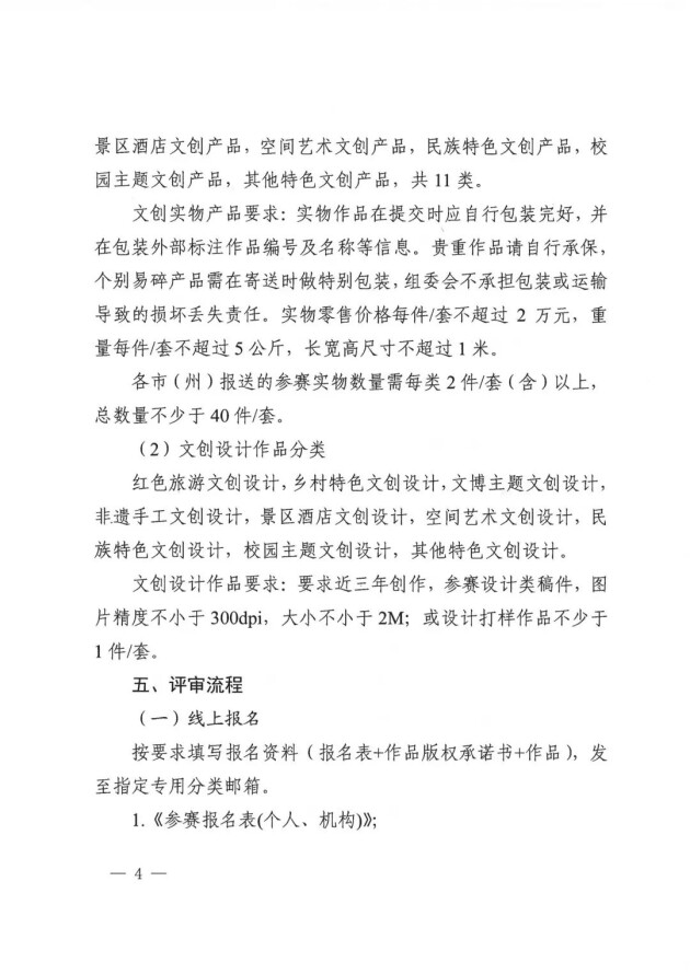 参赛作品分为文创实物产品、文创设计作品两大类,将经过线上报名、线上初评、实物作品报送、现场评审、公示等环节的考验严格评选出获奖作品。 大赛现已开通线上报名,参赛者需按要求填写报名资料,将报名表、作品版权承诺书、作品等三类信息,发至指定专用分类邮箱。 其中: 一、“红色天府”红色文创设计