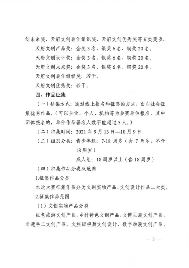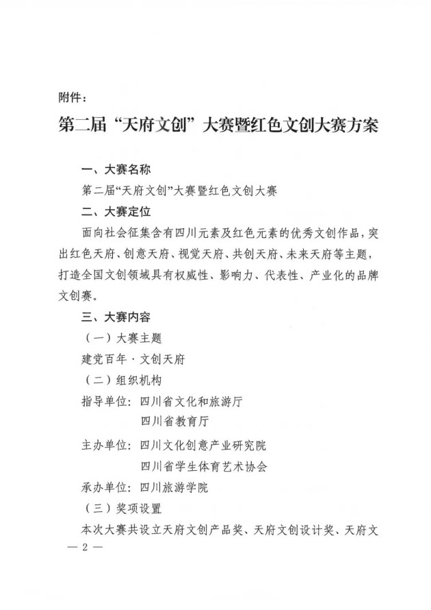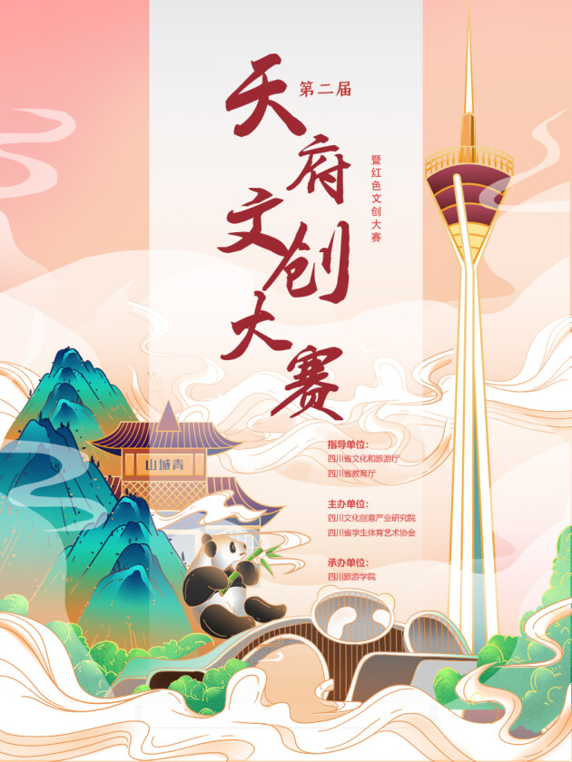 9月13日,由四川省文化和旅游厅、四川省教育厅指导,四川文化创意产业研究院、四川省学生体育艺术协会联合主办,四川旅游学院协办的第二届“天府文创“大赛暨红色文创大赛正式启动。 本届大赛以“建党百年·文创天府”为主题,旨在打造具有权威性、影响力、代表性、产业化的品牌文创大赛,进一步提升我省文化软实力和产业竟争力,助力文旅大产业提档升级。 大赛围绕红色天府、创意天府、视觉天府、共创天府、未来天府等主题,设立天府文创产品奖、天府文创设计奖、天府文创未来奖、天府文创最佳组织奖、天府文创优秀奖等五类奖项;分设青少年组和成人组两个组别(青少年组为7-18周岁,成人组为18周岁以上),以面向不同年龄层更广泛地征集含有四川元素及红色元素的优秀文创作品。
