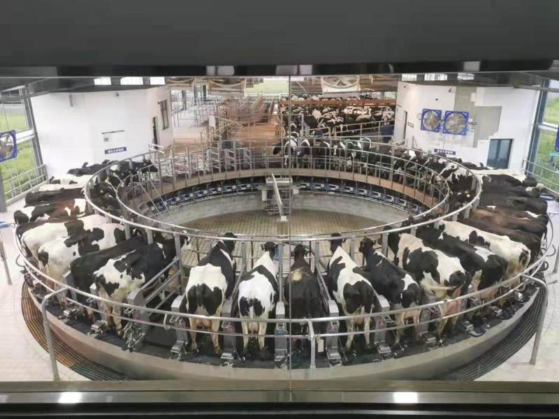 在产奶车间,全自动赶牛架根据设置要求启动,牛根据赶牛架的指引,自行走到挤奶盘上盘,大盘在自动以匀速转动,人只要站在一个地方,就可以依次给所有上盘的牛带上挤奶器,一千多头牛挤奶,现场只看到了2个操作工人,电气控制程序下的挤奶操作,规范,标准,产奶量及质量都非常的稳定,优质。
