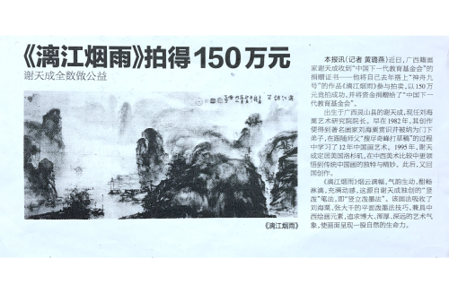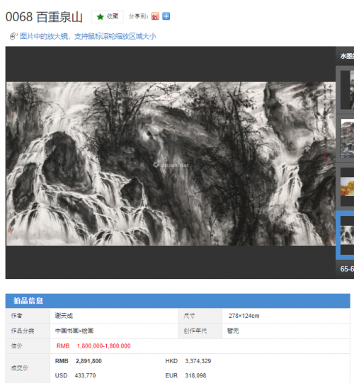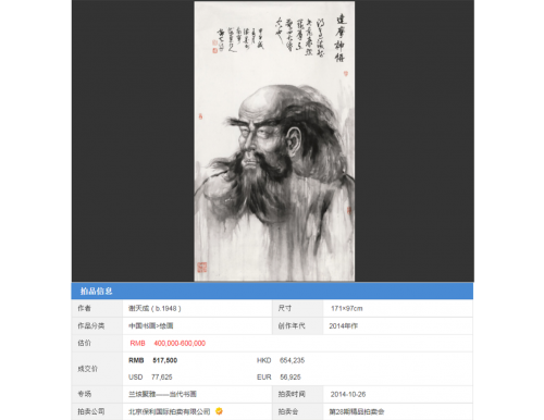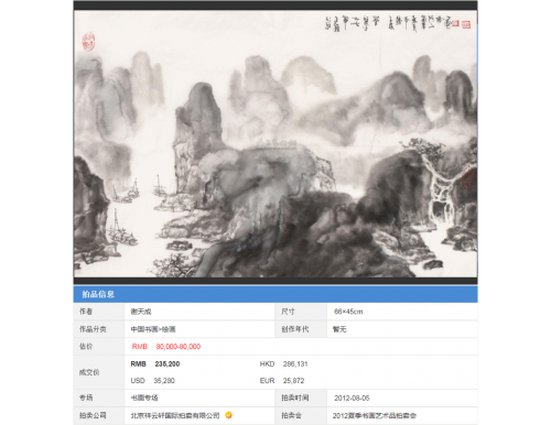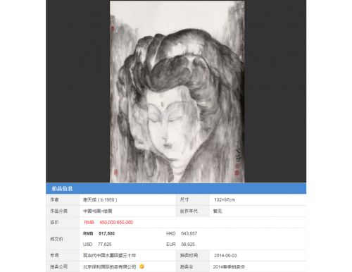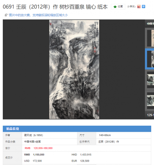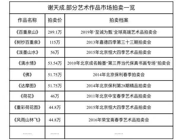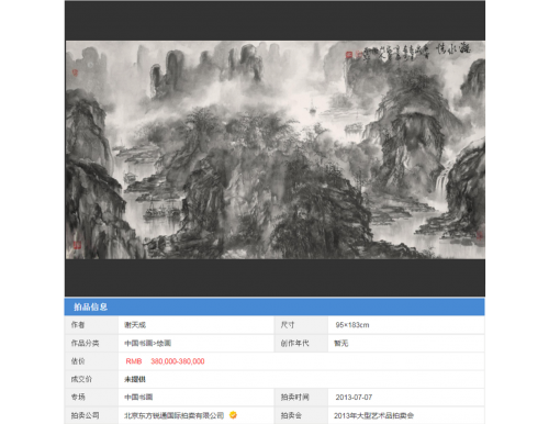 谢天成堪称拍卖界宠儿 是扩大国际收藏体系的王牌选择 谢天成作品拍卖市场极为活跃,涨幅明显。虽然一直久居国外,可他的不少作品也在我国的拍卖公司频频亮相,而且都以不俗的成交价格被一些收藏家所收藏。 谢天成也成为拍品在苏富比、瀚海、嘉德、保利、恒大四季等大型拍卖会上均有不俗表现的艺术家,收藏投资前景无限!