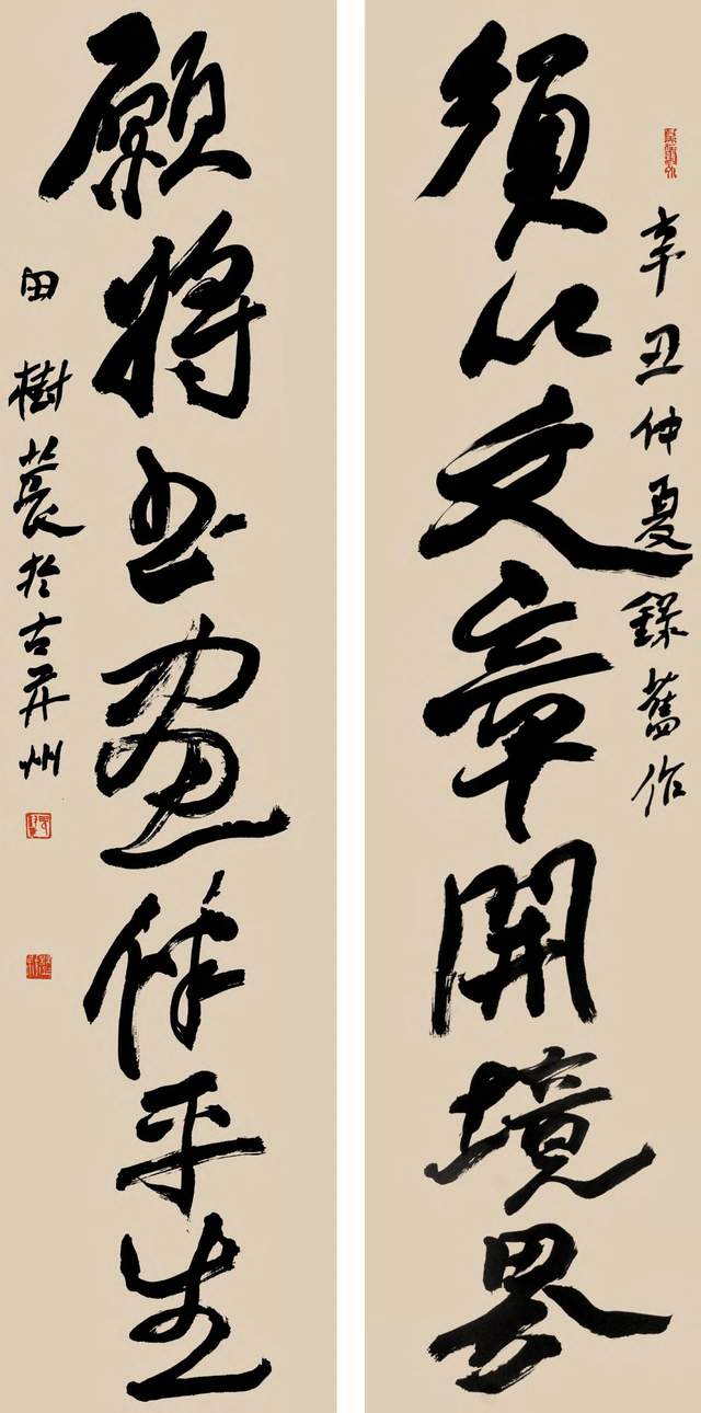 (《须以·愿将》联 行书) 在近三十年的相处当中,田老的书法一直影响着我,我奉他的书法为圭臬,佩服至极!