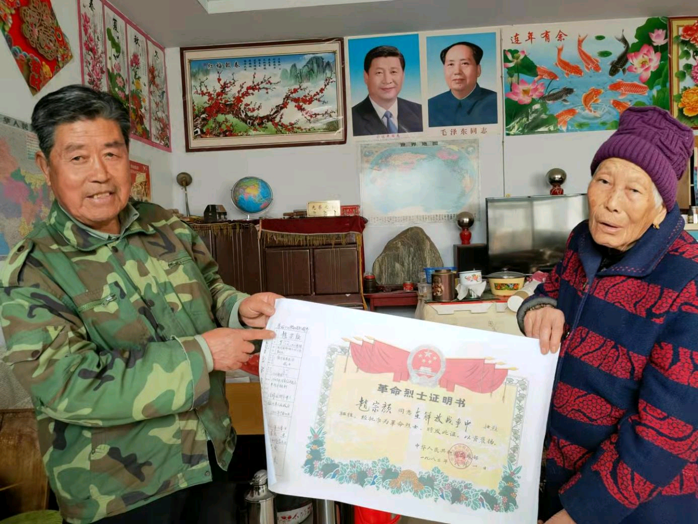赵长法和老伴巩祥真向记者展示父亲的革命烈士证明书