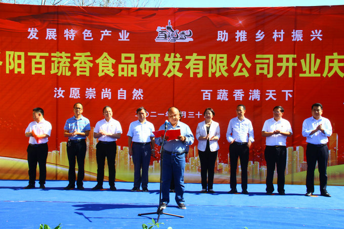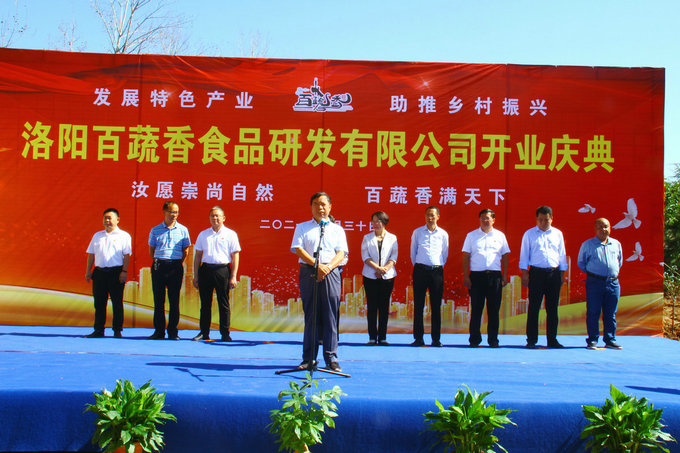 百蔬香食品研发有限公司董事长王振江讲话 在热烈地掌声中,汝阳县人大常委会副主任陈素霞作了重要讲话。她指出,柏树红薯作为国家地理标志农产品“汝阳红薯”的重要组成部分,是本地重点打造的拳头产品。今天洛阳百蔬香食品研发有限公司在柏树乡的落地生根,对于打造集育苗、种植、储藏、加工、销售与红薯全产业链的延伸发展意义重大。柏树乡要以此为契机,在全力支持链主企业发展上下功夫,聚焦延链补链强链,提升红薯产业链整体发展水平,推动红薯产业集群做大做强。要继续完善产业配套服务,在加大政策支持和完善体制机制上下功夫,加快推动以商招商,采取针对性强、可操作的措施,实实在在为企业解难题。要做好优化要素保障工作,积极与相关部门联动,提升保障能力,为红薯产业发展创造良好环境,助力红薯经济高质量发展。 汝阳县人大副主任陈素霞 讲话 在热闹非凡的锣鼓声与鞭炮声中,有关领导、嘉宾徐徐拉开了洛阳百蔬香食品研发有限公司的“红头纱”,现场掌声四起、欢声雷动。