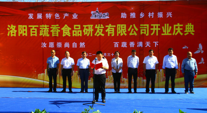 柏树乡副乡长朱文津主持开业仪式 柏树乡乡长张守志代表乡党委、政府致辞,对红薯产业园暨百蔬香食品研发有限公司的开业致以热烈祝贺。他说,“洛阳百蔬香食品研发有限公司是乡党委、政府引进乡贤创客招商兴业的重点项目。该项目的运营,有利于全乡逐步打造高效种植、加工贮藏、产品深加工的全产业链条的拓展,对拉动就业、带动增收、壮大村集体经济、助推乡村振兴意义深远”。