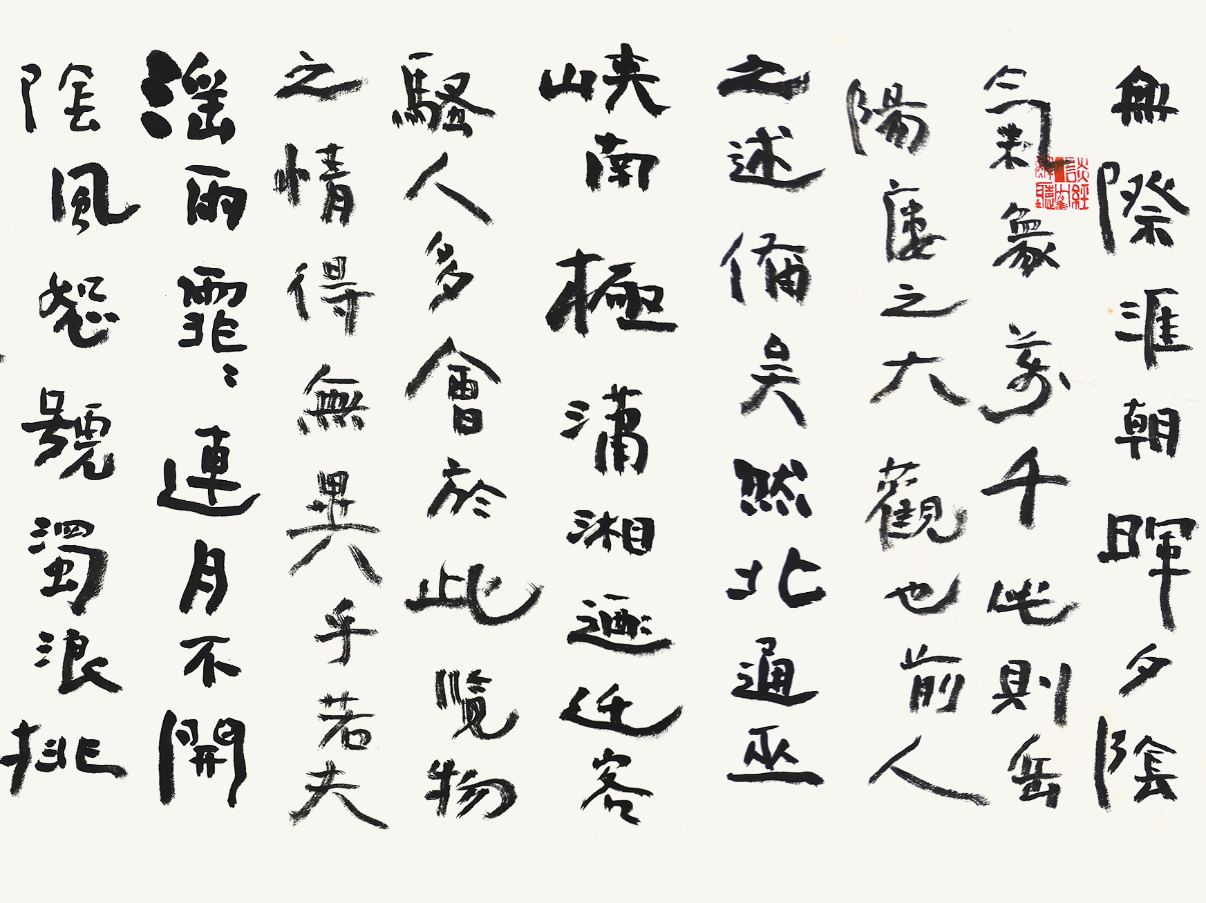 作品规格:500㎝x53㎝ 创作时间:2021年9月 庆历四年春,滕子京谪守巴陵郡。越明年,政通人和,百废俱兴,乃重修岳阳楼,增其旧制,刻唐贤今人诗赋于其上,属予作文以记之。 予观夫巴陵胜状,在洞庭一湖。衔远山,吞长江,浩浩汤汤,横无际涯,朝晖夕阴,气象万千,此则岳阳楼之大观也,前人之述备矣。然则北通巫峡,南极潇湘,迁客骚人,多会于此,览物之情,得无异乎? 若夫霪雨霏霏,连月不开,阴风怒号,浊浪排空,日星隐曜,山岳潜形,商旅不行,樯倾楫摧,薄暮冥冥,虎啸猿啼。登斯楼也,则有去国怀乡,忧谗畏讥,满目萧然,感极而悲者矣。 至若春和景明,波澜不惊,上下天光,一碧万顷,沙鸥翔集,锦鳞游泳,岸芷汀兰,郁郁青青。而或长烟一空,皓月千里,浮光跃金,静影沉璧,渔歌互答,此乐何极!登斯楼也,则有心旷神怡,宠辱偕忘,把酒临风,其喜洋洋者矣。 嗟夫!予尝求古仁人之心,或异二者之为,何哉?不以物喜,不以己悲,居庙堂之高则忧其民,处江湖之远则忧其君。是进亦忧,退亦忧。然则何时而乐耶?其必曰“先天下之忧而忧,后天下之乐而乐”乎!噫!微斯人,吾谁与归?时六年九月十五日。
