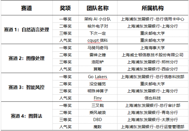 最终,经过专家评审的严格考量,综合线上算法赛得分和视频路演赛表现,以下战队在各自赛道突出重围,获得优胜: