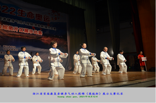 ——记浙江省首届癌症患者生命奥运八段锦(慈航杯)展示赛 2021年10月12日,浙江省首届癌症患者生命奥运八段锦(慈航杯)展示赛在新昌县文化礼堂隆重举行,共有绍金衢三地六支代表队到场参赛。参加人员精神饱满、正气高涨、功夫到位、各扬所长,赢得与会者阵阵掌声与由衷的赞赏。