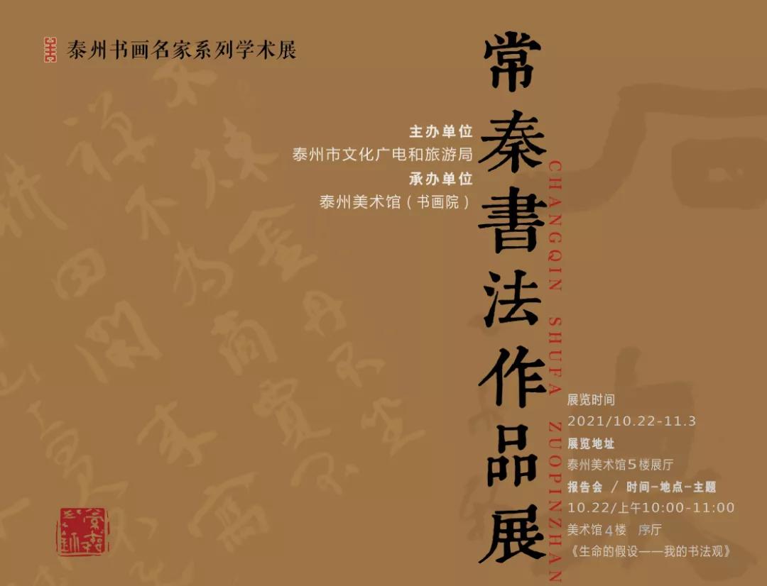 主办单位 泰州市文化广电和旅游局 承办单位 泰州美术馆(书画院) 展览地点 泰州美术馆5楼展厅 展览时间 2021年10月22日-11月3日 (展览不设开幕式) 讲座时间 2021年10月22日上午10点-11点 讲座地点/主题 泰州美术馆4楼 序厅 《生命的假设-我的书法观》 前言 丹青流韵,翰墨芳华,跨越千年,泰州文脉一直在传承创新中赓续。立足新起点,着眼文化高质量发展,泰州市委、市政府把文化名城与医药名城、生态名城一起,作为城市的主体战略来推进,作为泰州的关键品牌来打造,现代公共文化服务体系建设水平得到全面提升,文艺精品创作硕果累累,美术书法创作呈现出较大繁荣,涌现出一批优秀书画家,在国家、省级各类专业赛事中“泰州作品”常有亮相,为不断彰显江海文化的底蕴和自信,全力打造令人向往的“幸福水天堂”作出了积极贡献。 新时代要有新气象更要有新作为。作为泰州美术馆最新启动的品牌活动,泰州书画名家系列学术展旨在以书画为载体,进一步推进泰州文化建设,繁荣群众美术书法创作,为书画家们提供一个展示、交流、切磋、分享的平台,聚焦新主题主旋律创作,坚持主流价值引领,不断锤炼和提高泰州书画的精神高度、文化内涵和艺术价值,同时引导广大泰州书画家深入生活、扎根人民,将社会责任放在第一位,深刻认识到新时代作为文艺工作者所担负的历史使命和责任,真正以叫得响、传得开、留得住的文艺精品奉献社会,在为祖国、为人民立德立言中成就自我、实现价值。 守住一份坚持,点亮一片星空。本次系列展览由泰州市文广旅局主办,泰州美术馆承办,面向我市近年来在国家、省各类展览中获奖及在泰州地区书画创作有较高造诣的书画家,根据双向选择的原则,在举办展览的同时,为广大市民举行一场公益书画辅导,使之成为一个不断延伸的学术话题和公益品牌。凤城飘香翰墨,艺术薪火相传,期待通过这样的系列展,为加强本地文艺精品创作、推动文化交流发挥桥梁作用,更是为泰州文化名城建设增添一个新动力。 作者简介