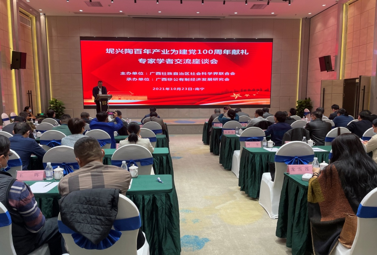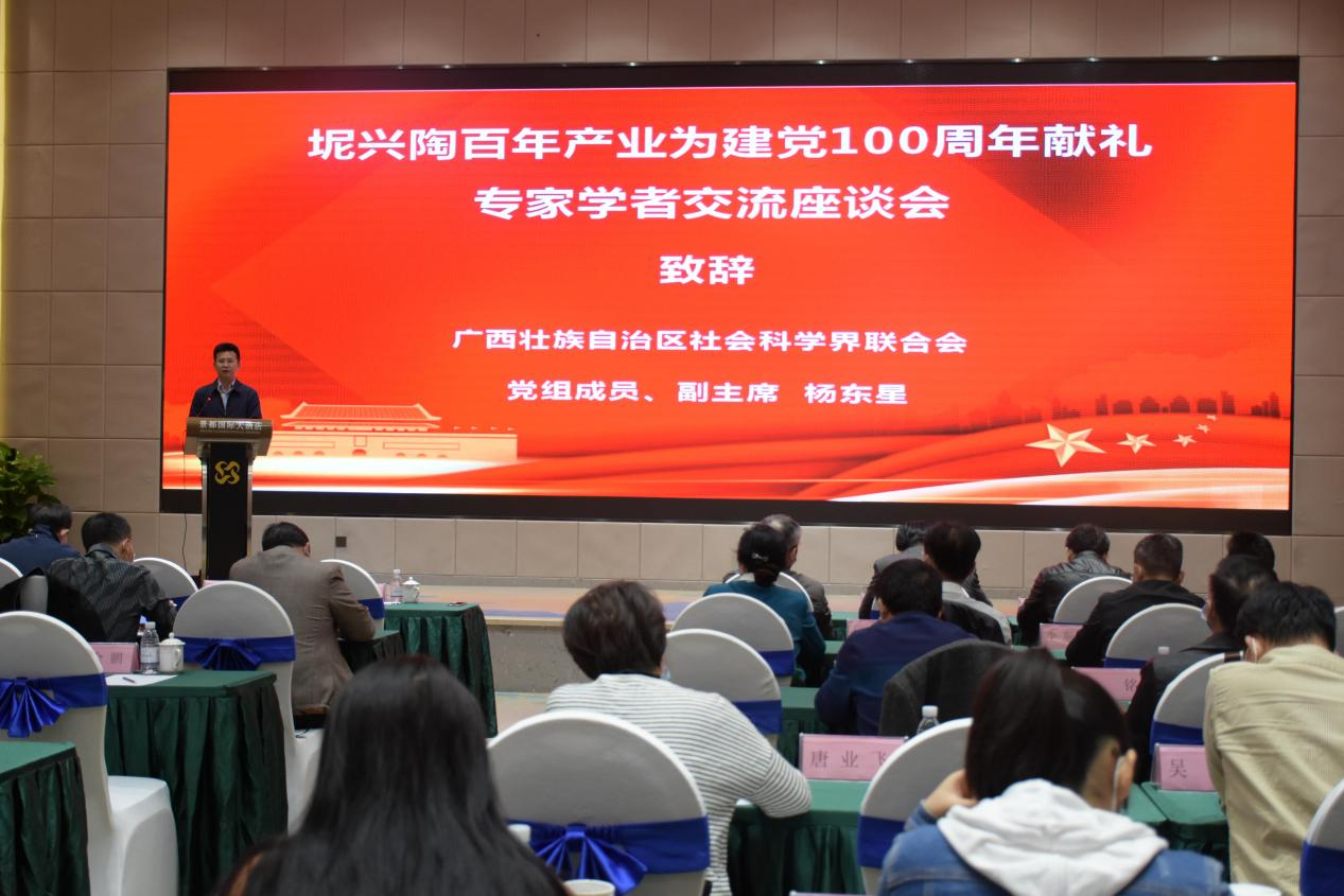 10月23日上午,由自治区社科联主办,广西非公有制经济发展研究会承办的坭兴陶百年产业专家学者交流座谈会在南宁市举办。自治区社科联党组成员、副主席杨东星参加座谈会并致辞,来自广西区内坭兴陶行业的研究专家、从业者等80人参加了座谈会。 ![]()