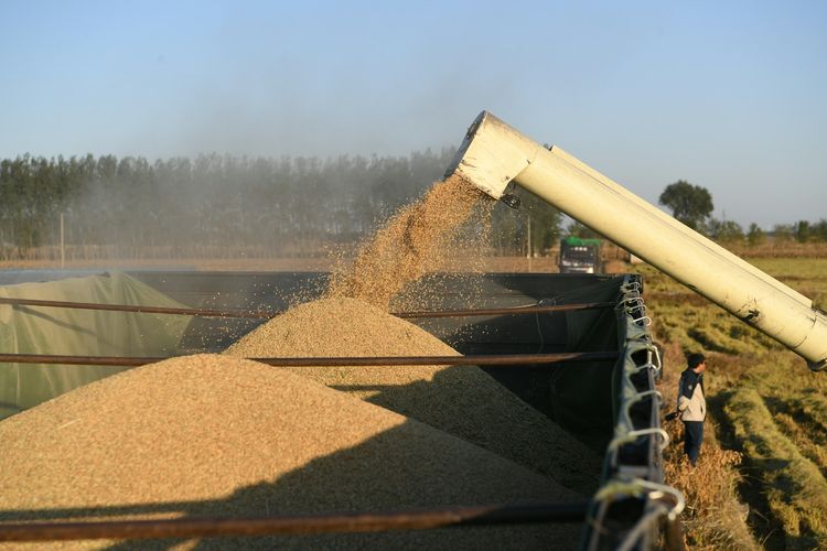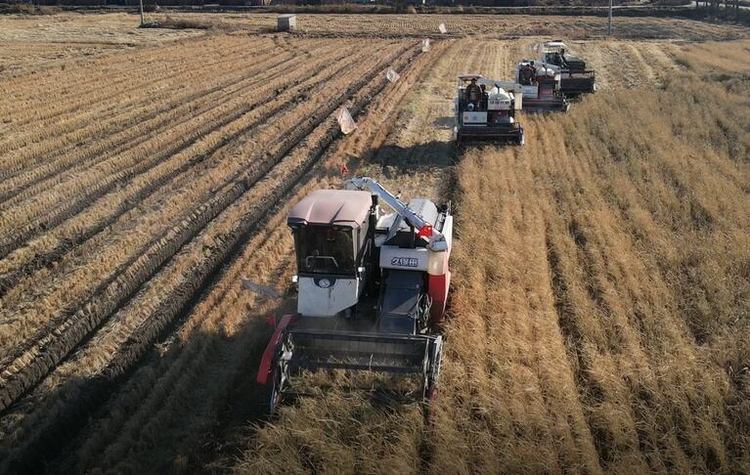 2021年10月23日,记者在黑龙江省通河县人和兴水稻农民专业合作社生态旱稻科技示范基地看到,大型机械收割机正在紧张作业,稻田里一片丰收繁忙的景象。今年,通河县人和兴水稻农民专业合作社生态旱稻科技示范基地一共培育了7样品种,五种颜色的旱稻,种植面积有800 亩左右,亩产900余斤。