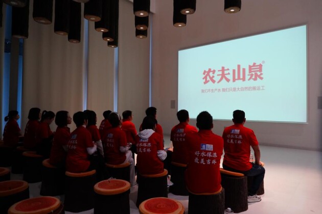 白桦林后是独具特色的森林放映厅,在森林深处,青年企业家们在“树桩椅”上观看着农夫山泉的介绍宣传片,聆听着农夫山泉的故事。