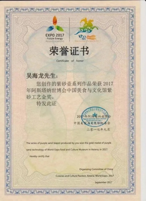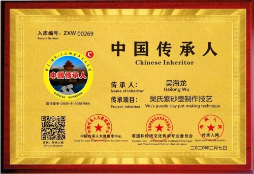 今年吴海龙大师刚被选为世界文化遗产大使,今年在这整个世界上,华人也只有两位,另一位是一个旅居法国的90多岁的老太太。 吴海龙,中国工艺美术大师,紫砂壶型设计大师、中国国礼特供艺术家、手工艺术专业委员会会员。中国文化遗产保护传承人物、中阿经贸合作论坛艺术宣传大使、中国书法文化研究所创作中心客座教授、中华民族伟大复兴杰出贡献人物。中华民族杰出艺术家,中国囯际现代艺术研究中心终身艺术顾问。 中国领导干部龙文化书画院紫砂艺术馆馆长、“吴氏金鼎”品牌创始人,吴氏陶艺紫砂艺术馆馆长,诚信紫砂艺术家。 吴氏陶艺第五代传人吴海龙从小聪明智慧,幼随父习艺,薰艺家风,承前启后,把吴氏紫砂绝艺发扬光大。吴海龙自幼乐于收藏,从家藏老壶中传承并创新,他设计的紫砂壶外形既尊重传统,又“方非一式,圆不一相”,突出变化,外形既古雅时尚、又朴实自然。其作品寓意于壶,还魂于砂,严谨而不泥古,典雅也趣于天然。