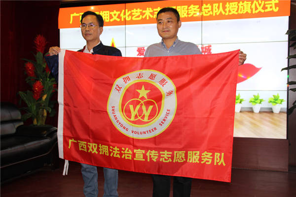 随着经济社会发展和人民思想道德素质的提升,我国的志愿服务体系越来越成熟,在扶贫、救灾、助医、助学等领域发挥着越来越重要的作用。11月26日下午,法治宣传网广西普法宣传站携手广西双拥文艺志愿服务总队共同组建双拥法治公益、双拥消防公益、双拥家风文化、双拥红色文化和双拥生态环保五个宣传服务队,并举行庄严的授旗仪式。参与授旗活动人员除了退役军人之外,还有部分是来自社会各界的有正能量敢担当的爱心企业家。