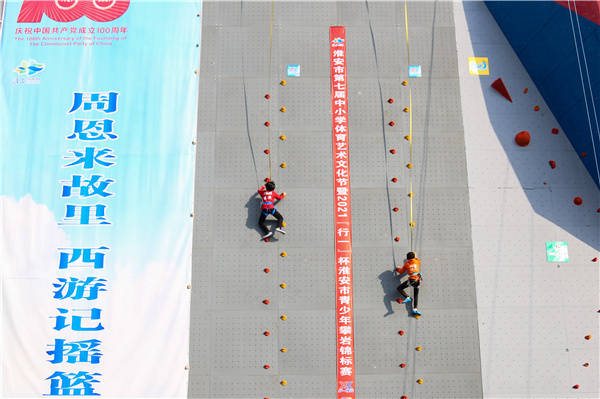 淮安市关天培小学、淮安经济开发区实验小学、淮安市周恩来红军中学东校区、淮安区腾飞手球俱乐部、淮安市楚州实验中学、淮安区青少年奥林匹克俱乐部、淮安市星海辰攀岩俱乐部等学校或俱乐部的7个代表队共70名运动员在攀岩壁上飞“岩”走壁,一决高下。