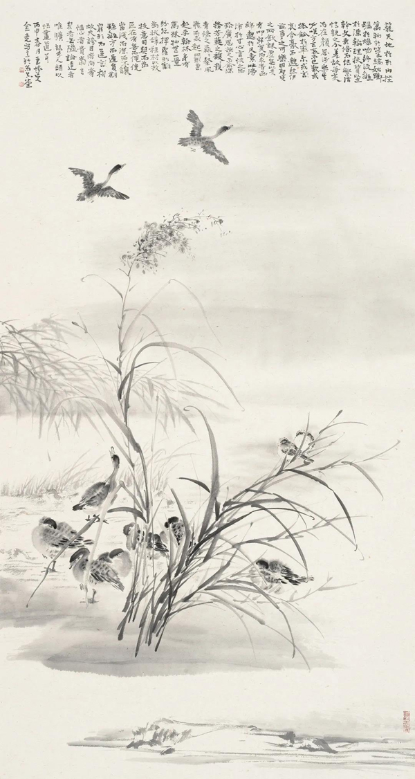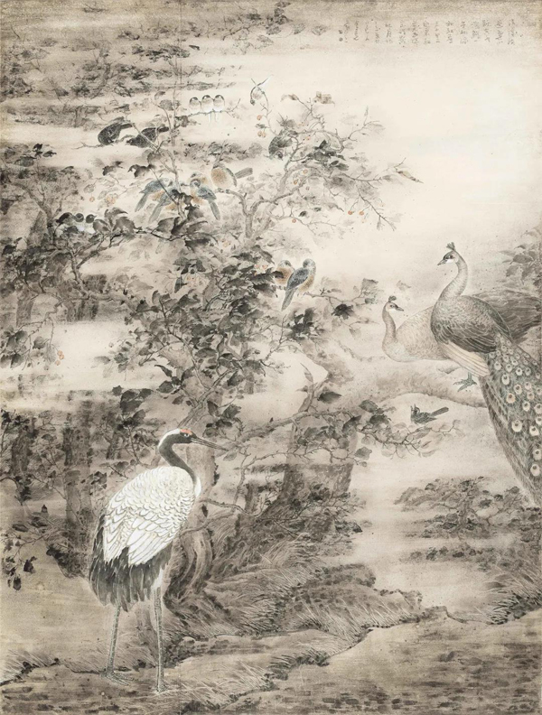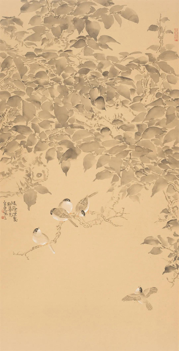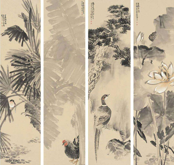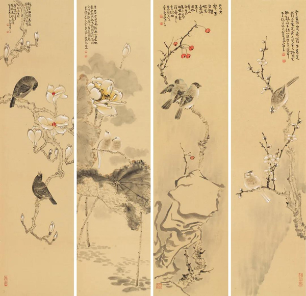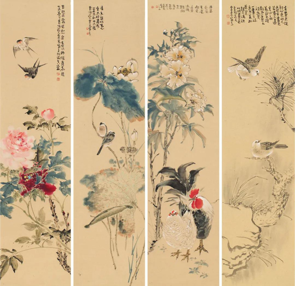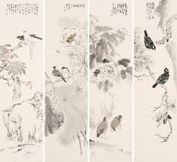 《四时花鸟皆学问》136cm×43cm×4