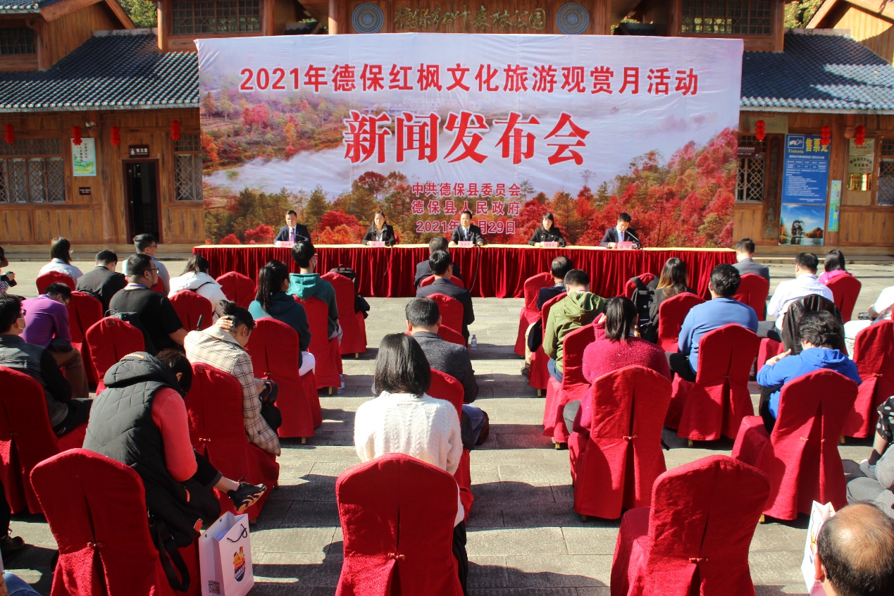 德保红叶森林公园 (图片来源于德保县委宣传部供图) 11月29日,德保县官方召开2021年德保红枫文化旅游观赏月活动新闻发布会,发布会介绍:2021年德保红枫文化旅游观赏月活动于12月火热开启。今年红枫文化旅游观赏月活动主题为“矮马枫情 醉美德保”,坚持政府主导、社会参与、展示文化、促进旅游,深度挖掘文化内涵,加强对外交流合作,精心策划具有地方特色、自主性强、参与度高的民俗文化旅游活动,推出一批重特色、高品质、系列化的旅游产品和旅游精品路线,集中展示德保自然风光、独特资源和人文景观,扩大德保矮马红枫、百粤文化旅游品牌影响力,展示“矮马枫情 醉美德保”主题形象,振兴文化旅游产业发展。