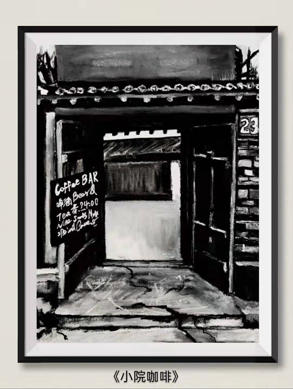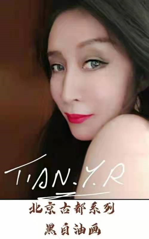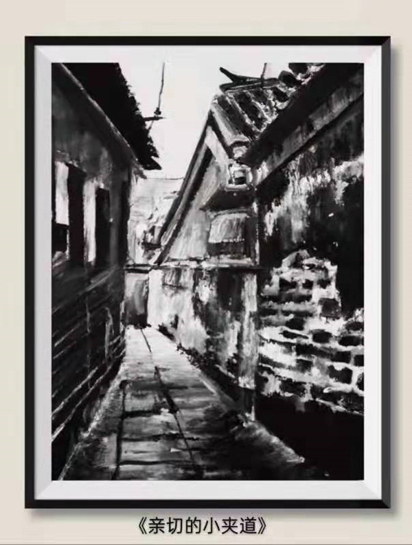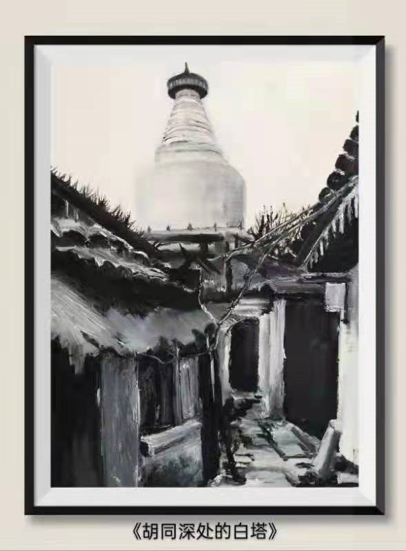 画家田迎人的作品,尤其是她的“老北京黑白油画系列”,譬如《儿时的鼓楼》、《半空中的雍和宫》、《胡同白塔》、《银锭桥》、《胡同口》、《院儿》、《在家吗》、《墙角》、《断“臂”之痛》、《亲切的小夹道》、《怀抱鲜花》、《最后的记忆》……正是突显古老的中华民族历史文化记忆的符号,带有特定的城市民居建筑环境元素,并具有鲜明的时代特征和深刻感人的形象印记。她用自己那颗火热的心灵——“好比一个干草扎成的火把”,点燃了多少人的心灵火种,真是这样的:“它本身先燃烧,而周围还得有别的火种也在燃烧,两者接触之下,火势才会更旺”。没有什么比胡同、四合院更能体现老北京的传统文化特色,她用简单、朴素的黑白两色将其定格,让艺术的感染力和影响力达到极致。在诉诸绘画语言的——艳丽与素雅、富贵与质朴、繁复与简约之间的选择中,她毫不犹豫地选择后者,坚定地认为“黑白影像”的描摹才是最为亲切、温暖的记忆,也最符合古都历史文化的本质特征。