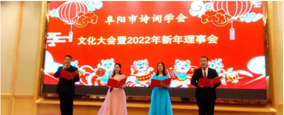 大会在《开门红》的音乐声中拉开帷幕。唐利飞先生以颍泉农商银行资产管理部总经理和阜阳市诗词学会副会长的双重身份,向大会致新年贺词,并介绍了颍泉农商银行的工作业绩;阜阳市诗词学会副会长吕丹丹女士代表学会作了《阜阳市诗词学会2021年工作总结和2022年工作设想》的报告。接着是文艺演出,参会代表纷纷上台展示才艺。有的激情朗诵自己为大会创作的诗词,有的引吭高歌抒发胸中的家国情怀,还有的倾情演奏经久不衰的经典名曲……
