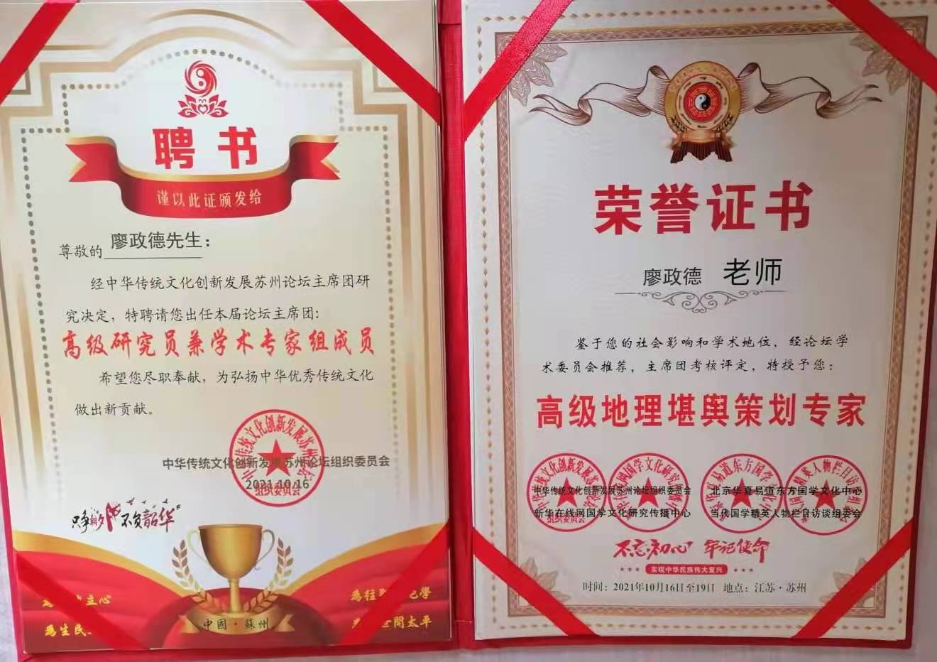 殊荣 学无止境,虽然廖进德己经胸有百万兵,掌上千秋史,但他仍不满足,近几年他又赴武汉,深圳易善缘等地拜师学易,通过学习他又掌握了九天玄数,财富易学的应用方法且运用自如,为他平时的易学实战增加了力量。廖政德认为易道文化经过几千年的发展,各门各派都有其合理性和优劣性,所以应该不排斥,在工作中求同存异,择其善者而从之,择不善者而改之,只有这样易学文化才能更好的向前发展。