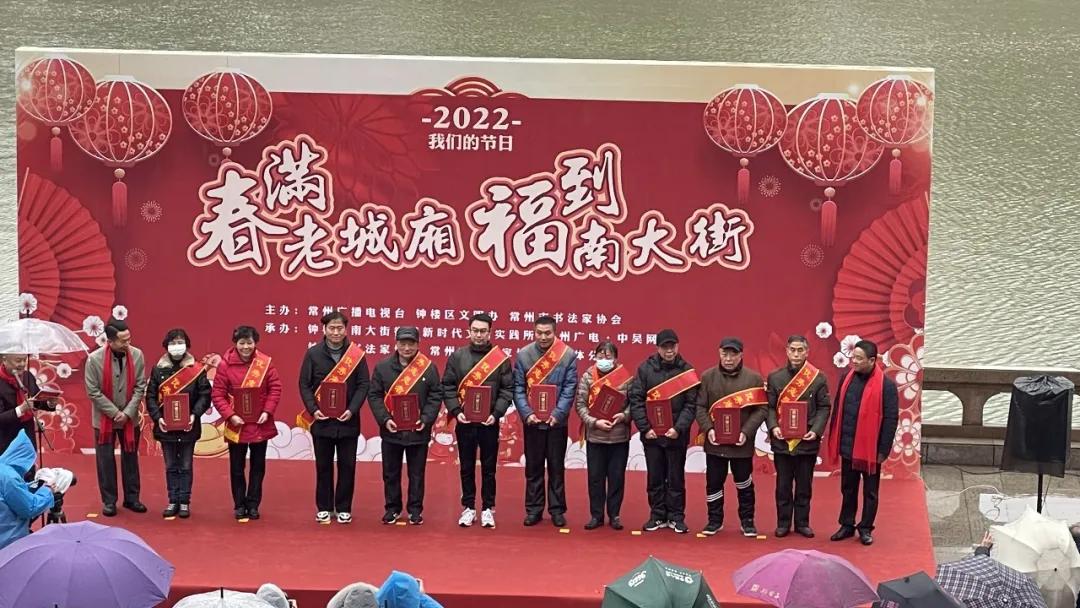 谢志诚代表南大街街道党工委、办事处致欢迎词,柯善学、陈清为优秀志愿者代表颁奖并赠送书法作品,高国俊、周冬军为“2022常州第一联”征集获奖作者颁奖,刘更城接受了“常州第一联”书家叶鹏飞的书法作品原件并颁发收藏证书,黄江、舒文、汤杰、朱明辉共同为“常州新春第一联”揭幕。活动仪式结束后,市书协和钟楼区书协的书家们,联合为参加活动的居民现场写福送春联,为大家送上新春的祝福,延续温暖和幸福的新春氛围。 作者:长生果 来源:长生果文化 新华在线网祁成志报道